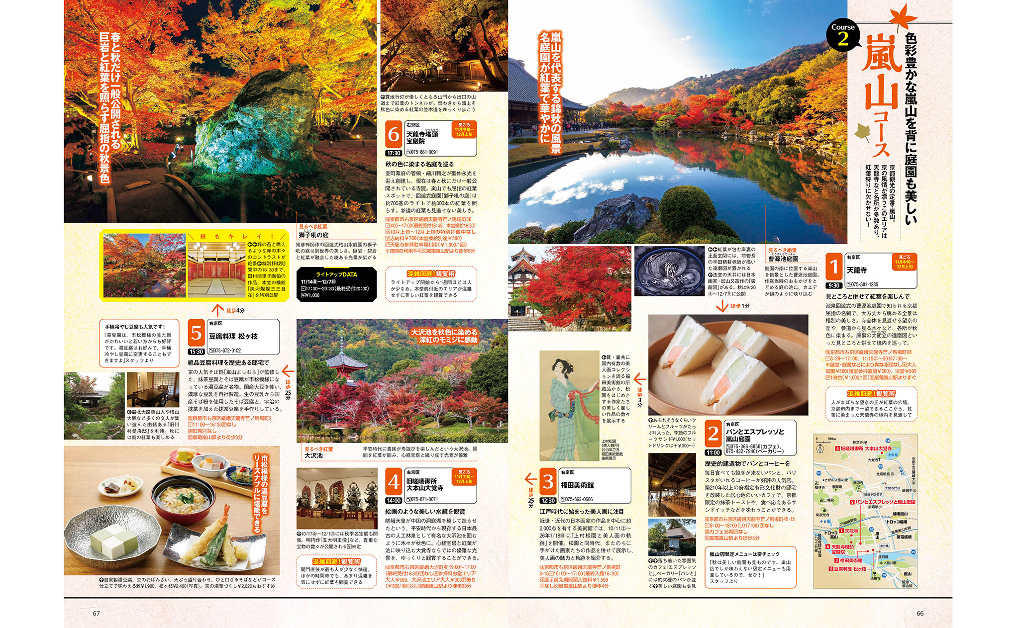 東山、嵐山など京都の紅葉名所や、合間に立ち寄りたい25年オープンのグルメ話題店をまとめました。本体から取り外して保存できる、秋の京都訪問に役立つ付録です。