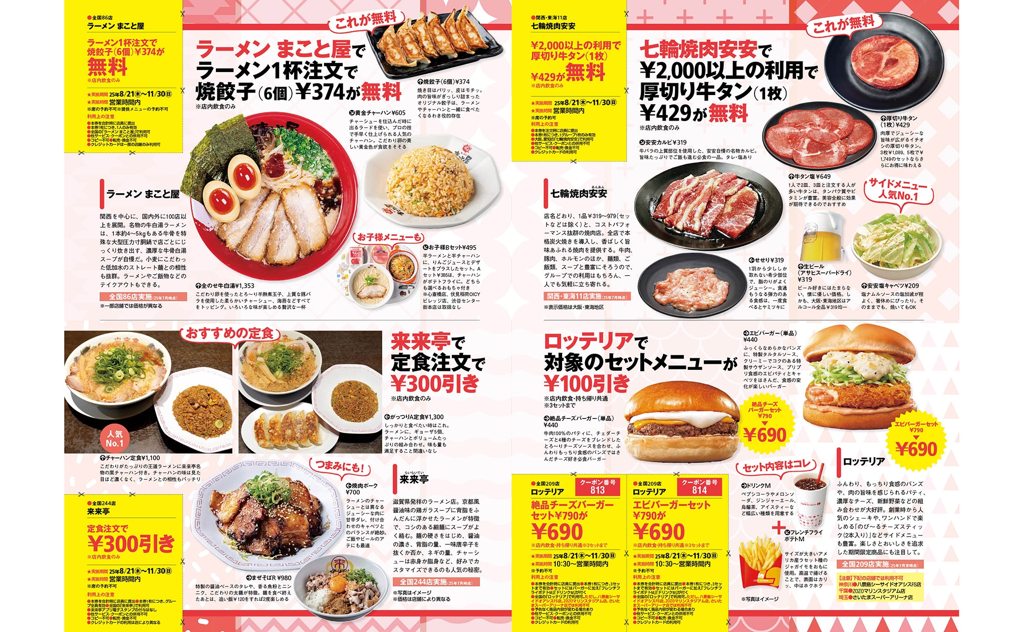 ほかにも餃子の王将、七輪焼肉安安、ロッテリア、ラーメンまこと屋、来来亭、ピザーラ、ビバパエリア、ザめしや、街かど屋、サンマルクカフェ、ビアードパパ、ディッパーダン、天麩羅 えびのや、きんのぶた、鶴橋風月、じゅうじゅうカルビ、創作オムライス ポムの樹、キッチンオリジン・オリジン弁当、らーめん古潭、つるまる饂飩・鶴丸饂飩本舗 が割引に!