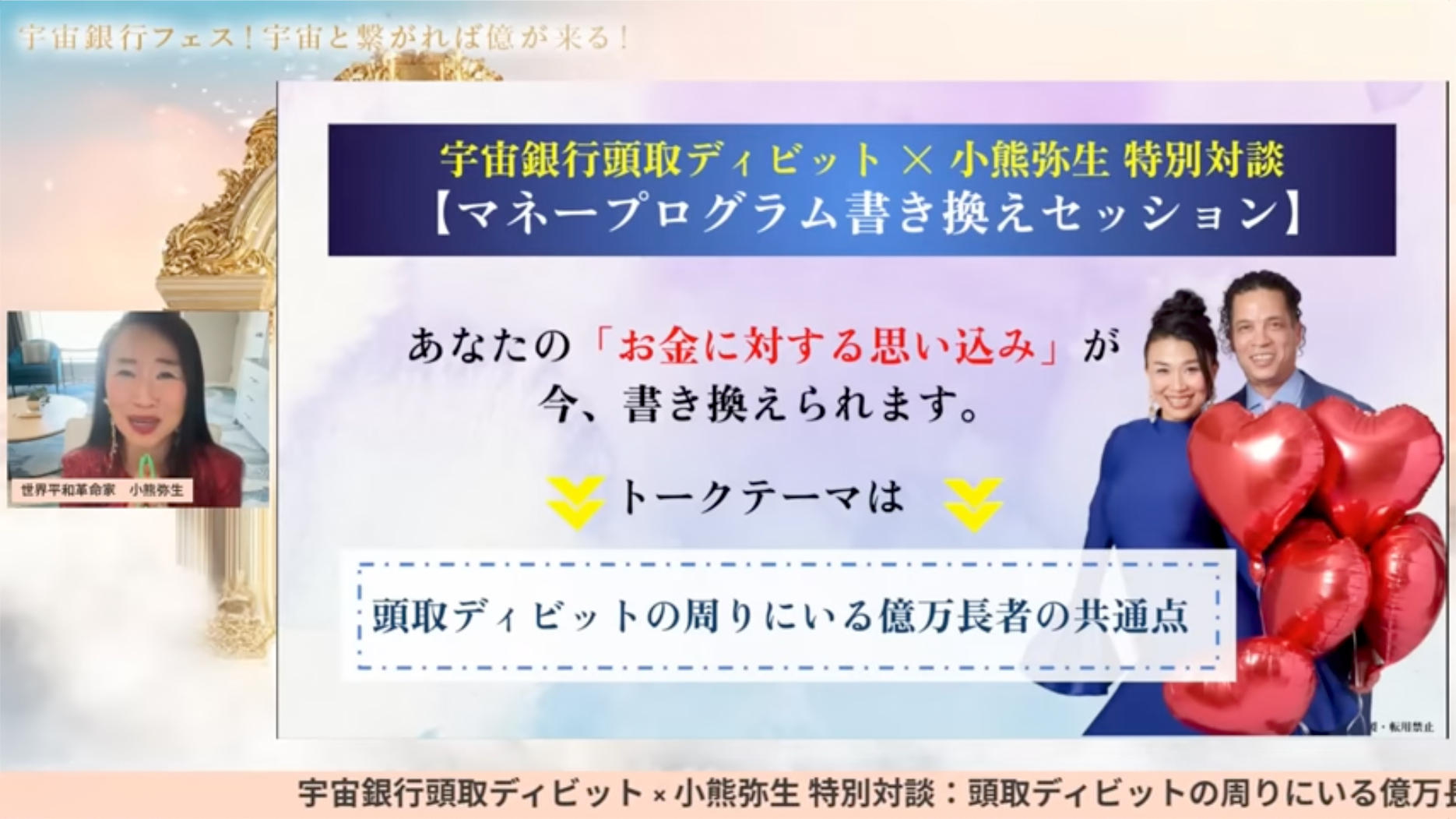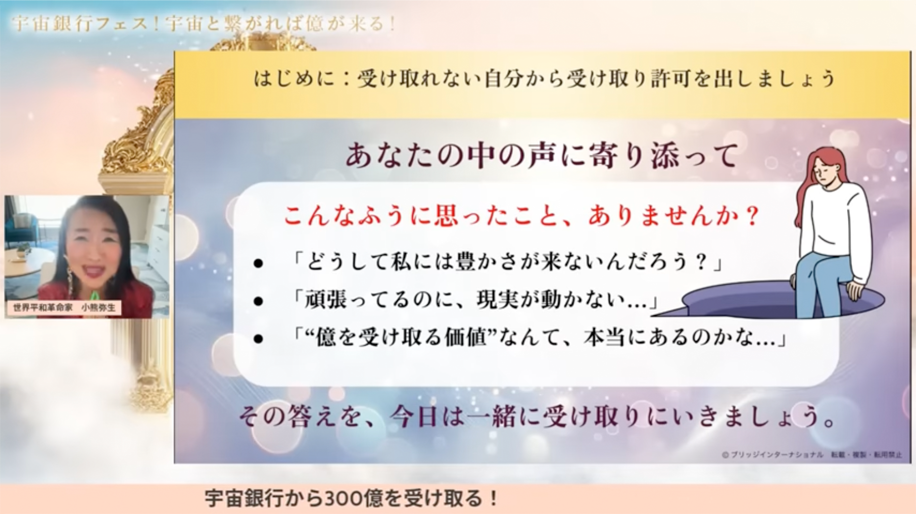 セミナーおよび各種講座の企画・開催、企業研修、コンサルティングなどを手掛ける株式会社ブリッジインターナショナル(本社:東京都港区、代表取締役・小熊弥生)は、2025年8月8日にオンラインイベント「宇宙銀行フェス〜宇宙と繋がれば億が来る!」を開催しました。2025年2月に発売された小熊弥生著『宇宙とつながれば「億」が来る!』(KADOKAWA)の内容を体験型で紹介するもので、当日は延べ1,700名以上がライブ配信に参加、動画の再生回数は14,460回を突破しました(8月18日現在)。