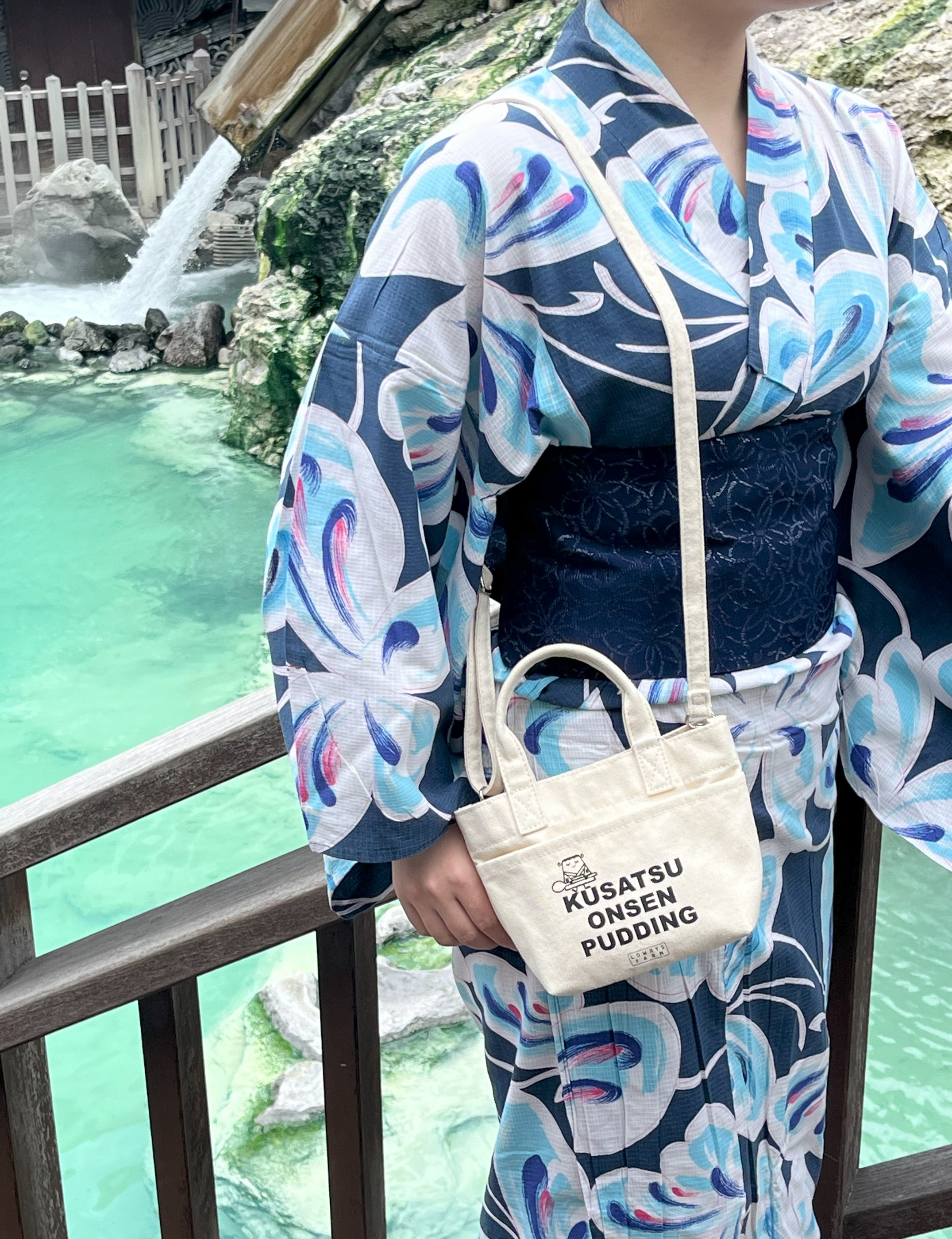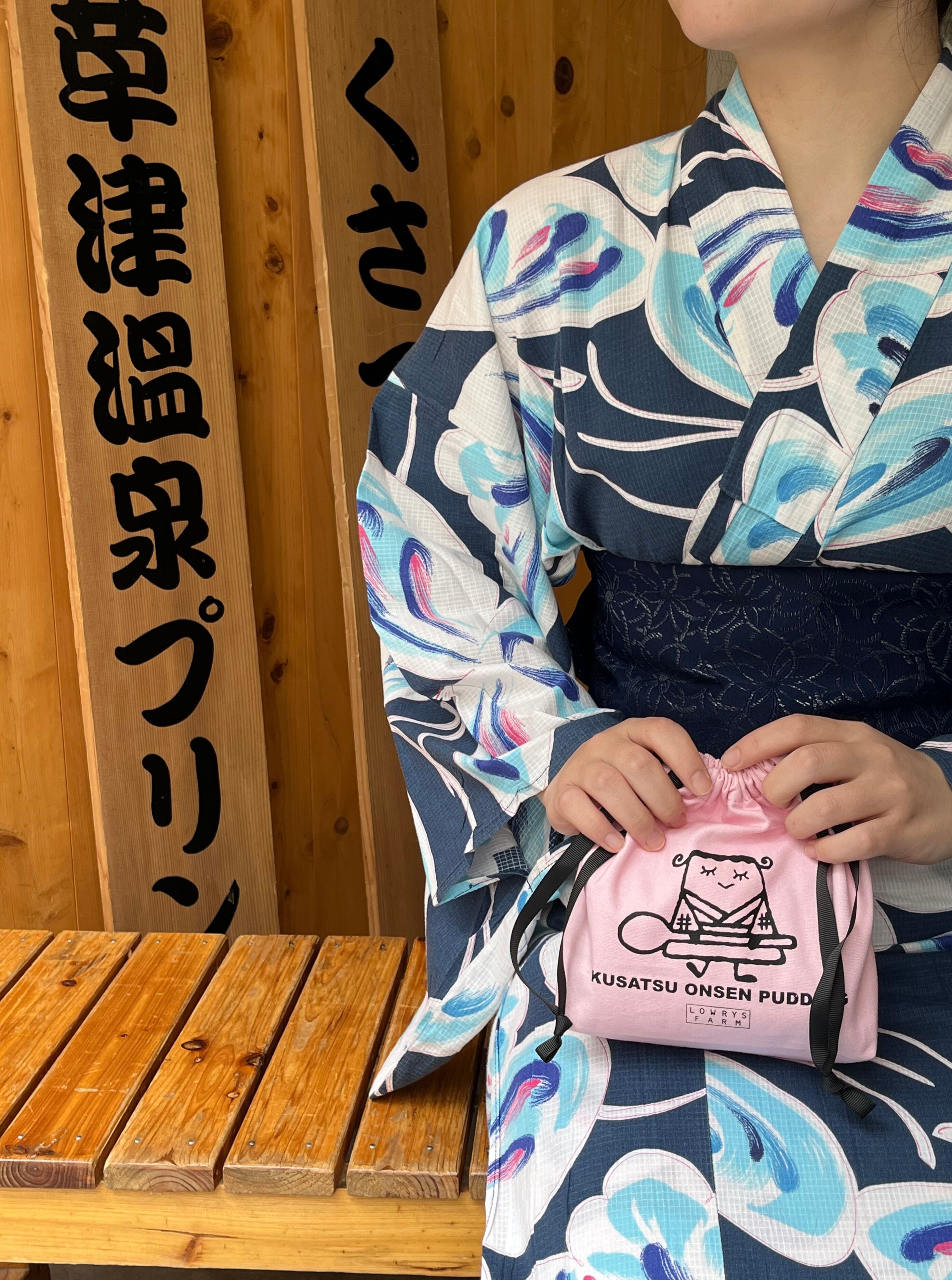 草津温泉の観光名所「湯畑」の鮮やかなエメラルドグリーンをイメージしたグリーンと、他の商品と同様可愛らしいピンクの二色をご用意し、ご自身は勿論、大切な方へのお土産としても幅広くご活用いただけるよう仕立てました。