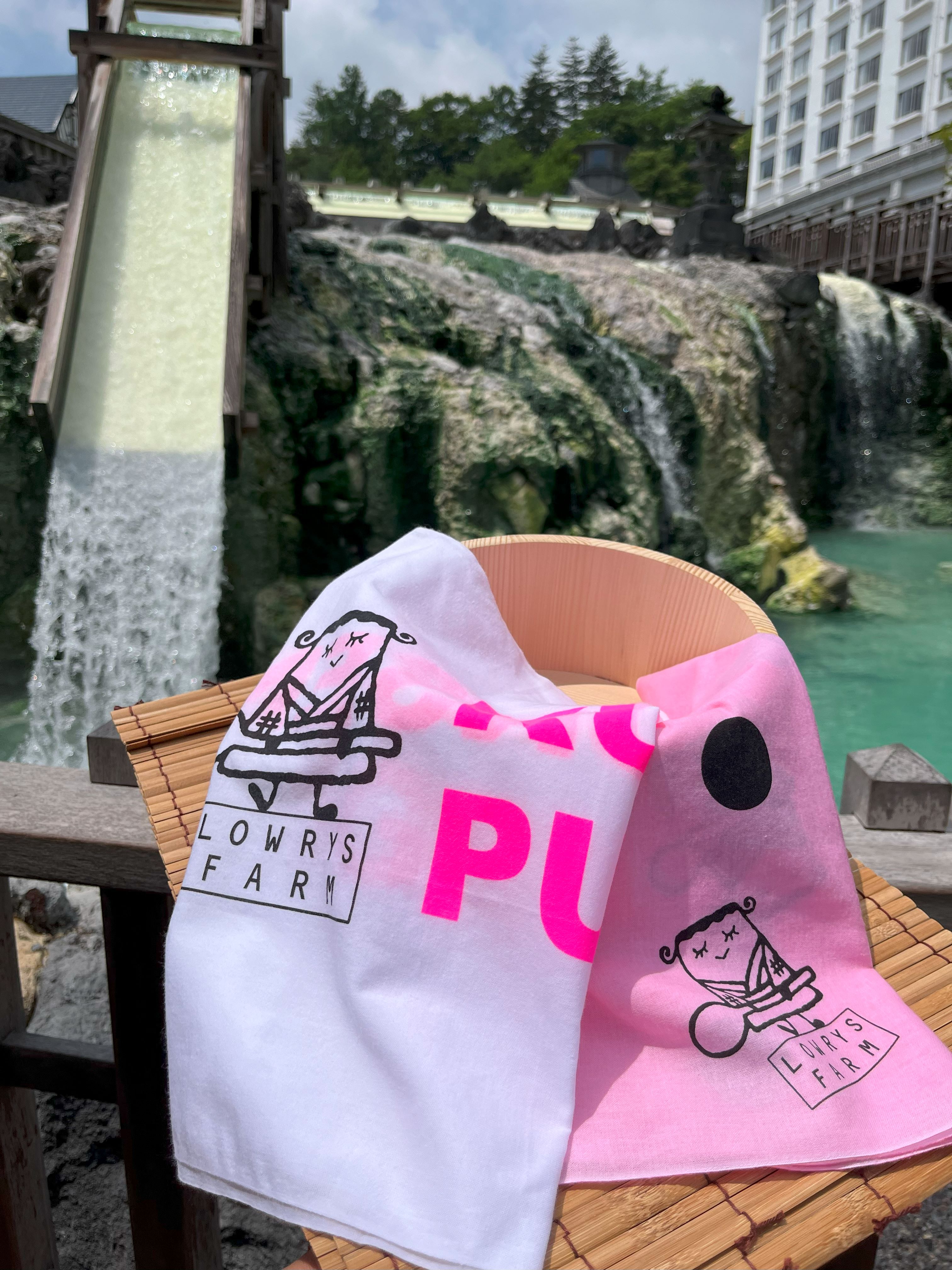 温泉地をイメージし、生成りの白とピンクの二色の手ぬぐいをご用意いたしました。