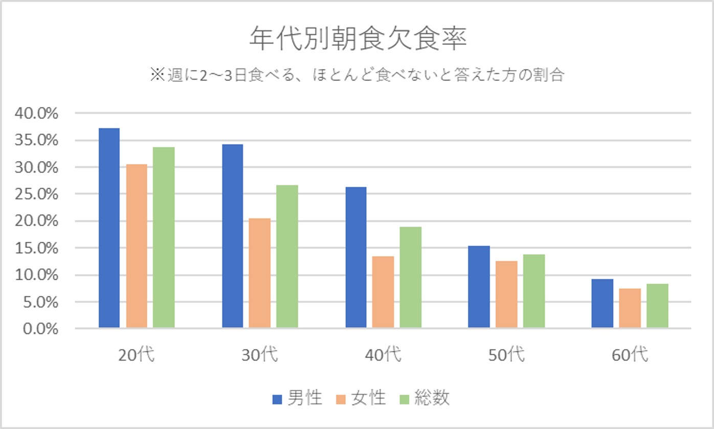農林水産省が実施した「食育に関する意識調査」(令和7年度)によると、20代・30代では朝食を「ほとんど毎日食べる」と回答した人はそれぞれ47.3%・64.5%にとどまっています。一方、40代で71.9%、50代で78.9%、60代では86.2%と、年齢が上がるにつれ朝食習慣が定着しております。