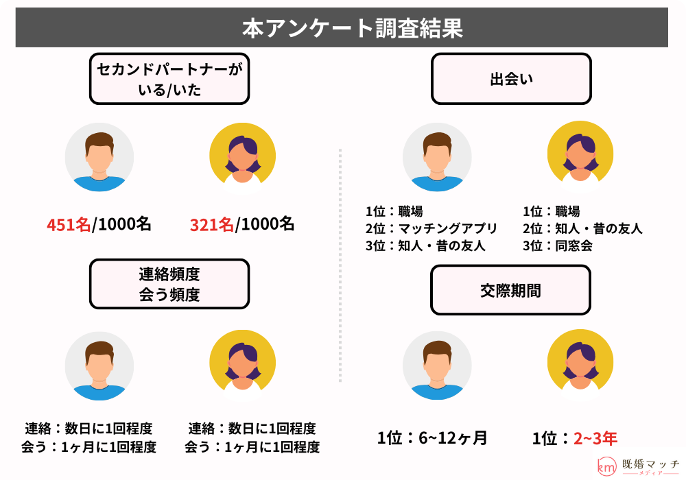 セカンドパートナーの実態調査!セカパがいる割合・出会いの場、連絡頻度・交際期間まで男女計2,000名にアンケート調査