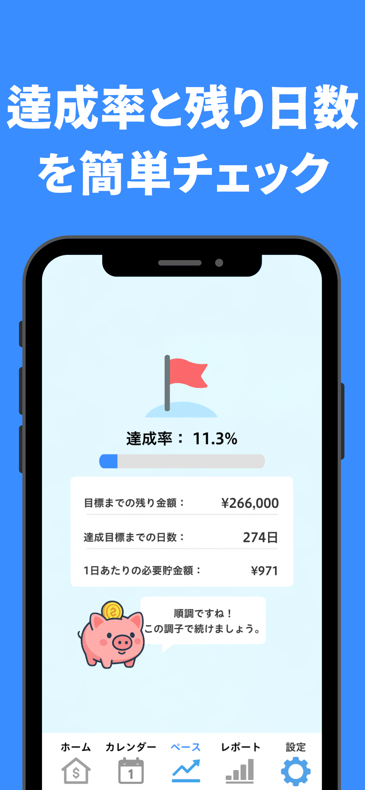 - 「あといくら必要か」「ペースは順調か」などがひと目でわかります。