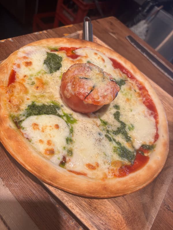 チーズたっぷり!丸ごとトマトが乗ったピッツァ。