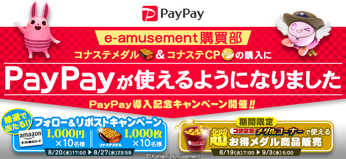 株式会社コナミアミューズメントは、8月19日(火)からPayPay株式会社が提供するキャッシュレス決済サービス「PayPay(ペイペイ)」をKONAMIが運営する「e-amusementサイト」内の「購買部※1」に導入したことをお知らせします。