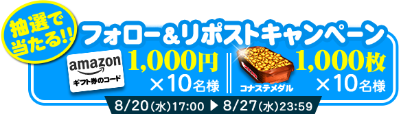 - 「Amazonギフトカード」1,000円分または「コナステ専用メダル」1,000枚をそれぞれ10名さま(合計20名さま)にプレゼントします。