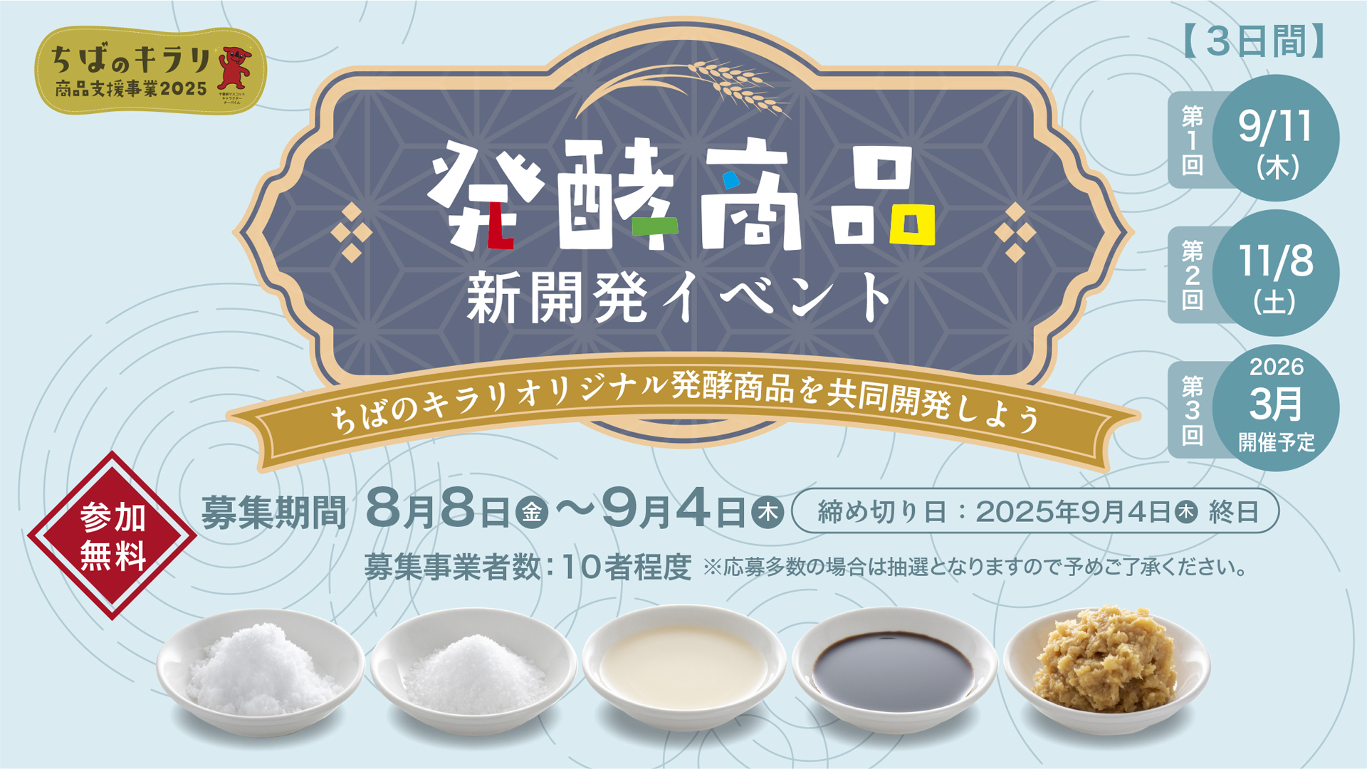 「発酵」という日本の伝統的な食文化を深く掘り下げ、千葉ならではのエッセンスを加えた魅力的な商品を共に創り上げ、新たな販路を開拓する意欲ある事業者の皆様のご参加をお待ちしております!