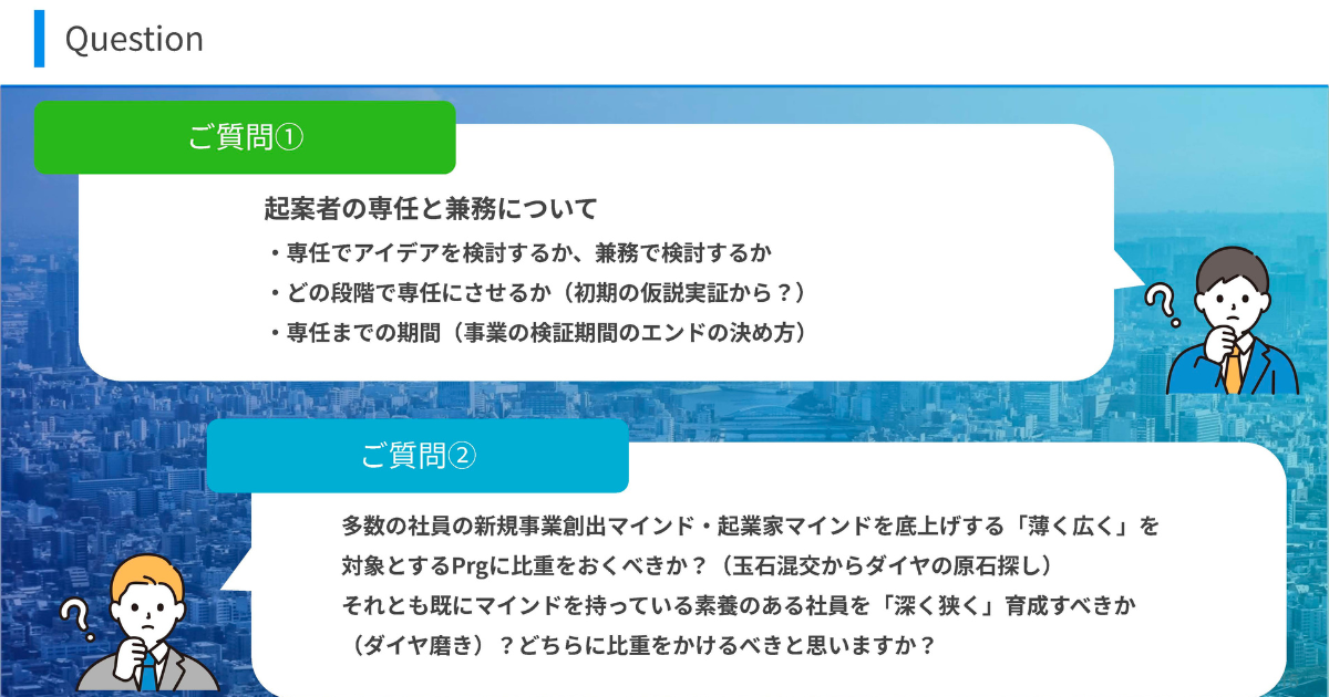 三倉は、これまでの新規事業開発や、上場企業・地方企業・官公庁への実務支援経験をもとに、現場の視点を重視した新規事業推進の考え方を共有し、会場からも多くの質問をいただきました。
