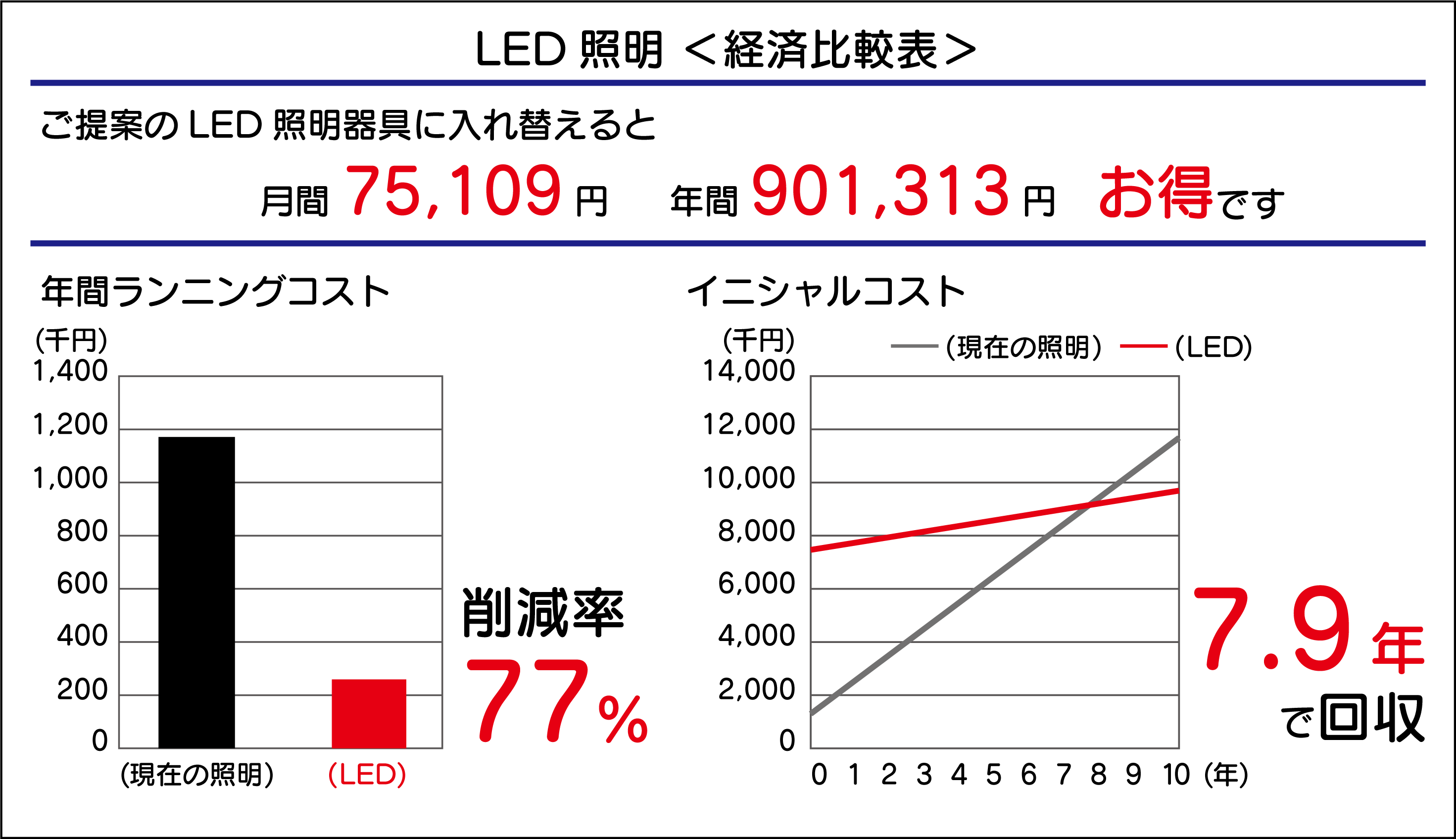 ▲当社でマンション全体のLED化工事を行った物件の経済比較表です