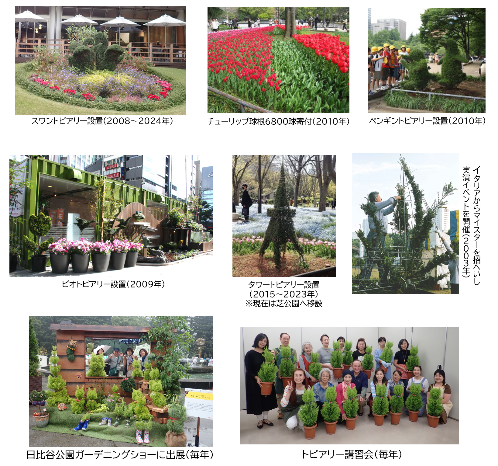 当協会は、NPO法人として15周年を迎える、国内唯一のトピアリー団体です。民間団体時代から17年にわたり、日比谷公園のボランティア団体として、花壇へのトピアリーの設置、メンテナンスなどを行っています。