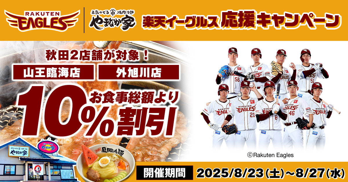 やまなか家は8月27日に秋田県で開催される楽天イーグルスの開催試合を記念して、秋田限定でお得な割引キャンペーンを開催致します。23日から秋田県の2店舗で実施されており、試合日の27日まで多くのお客様へお得に焼肉をご提供致します。楽天イーグルスの公式スポンサーとしてキャンペーンを通じて、少しでも盛り上げられるように致します。