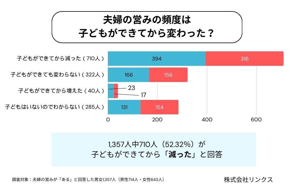 夫婦の営みが「ある」と答えた1,357人(男性714人・女性643人)に、子どもができてからの変化を尋ねたところ、