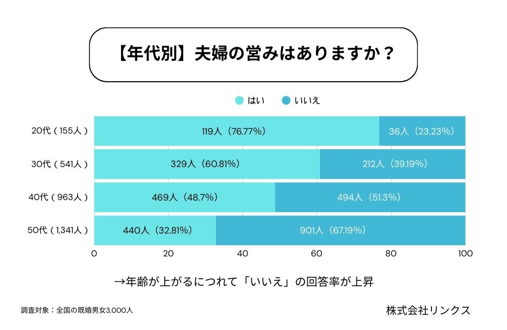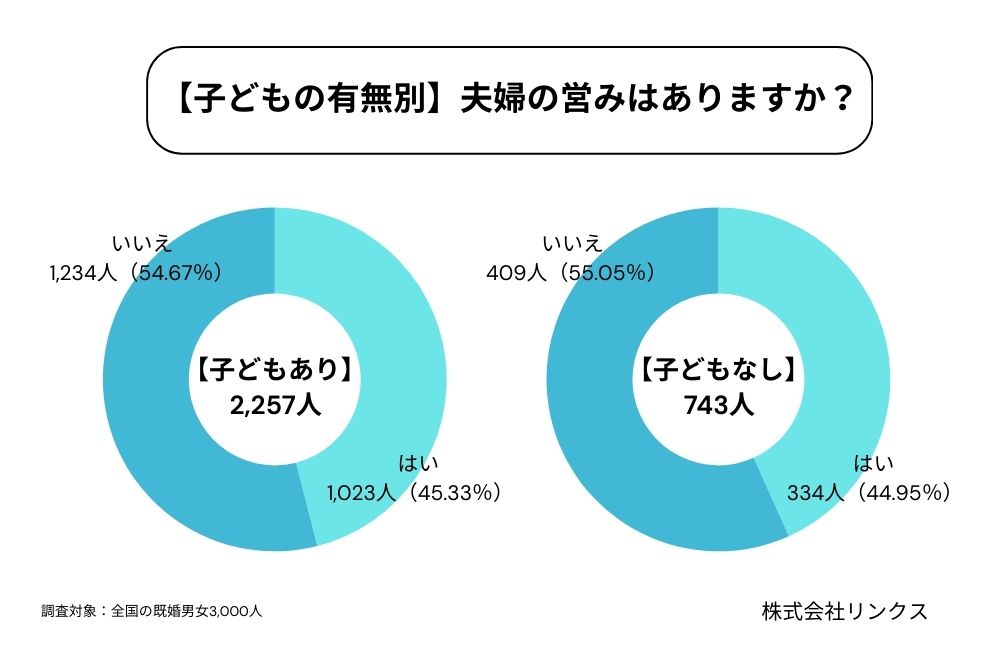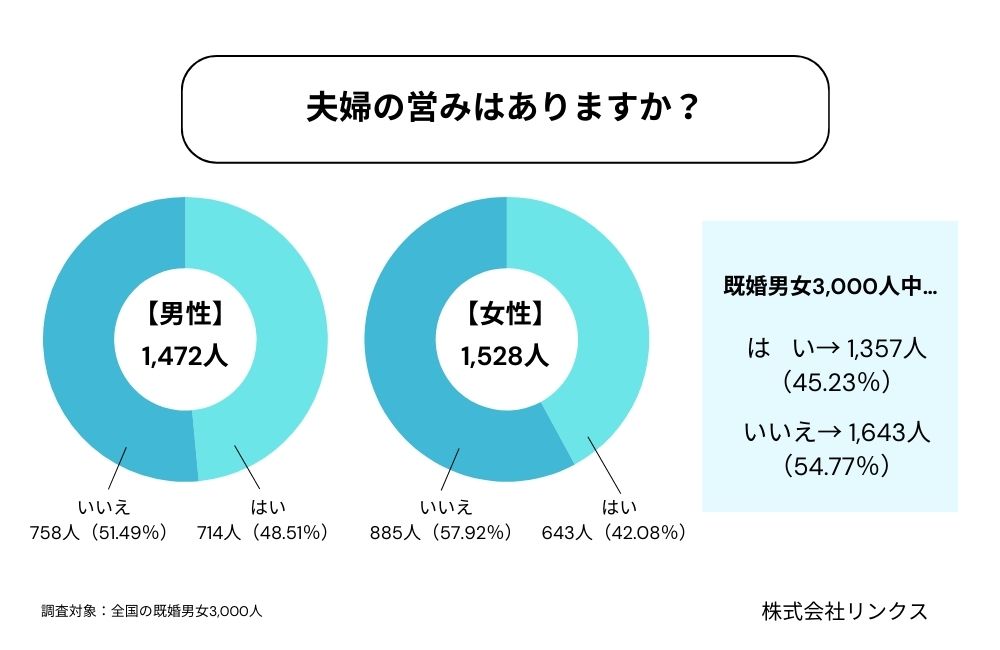 既婚者向けマッチングアプリ「既婚者クラブ」を運営する株式会社リンクス(東京都港区)は、全国の20歳〜59歳の既婚男女3,000人を中心に「夫婦の営み」に関するアンケート調査を実施しました。