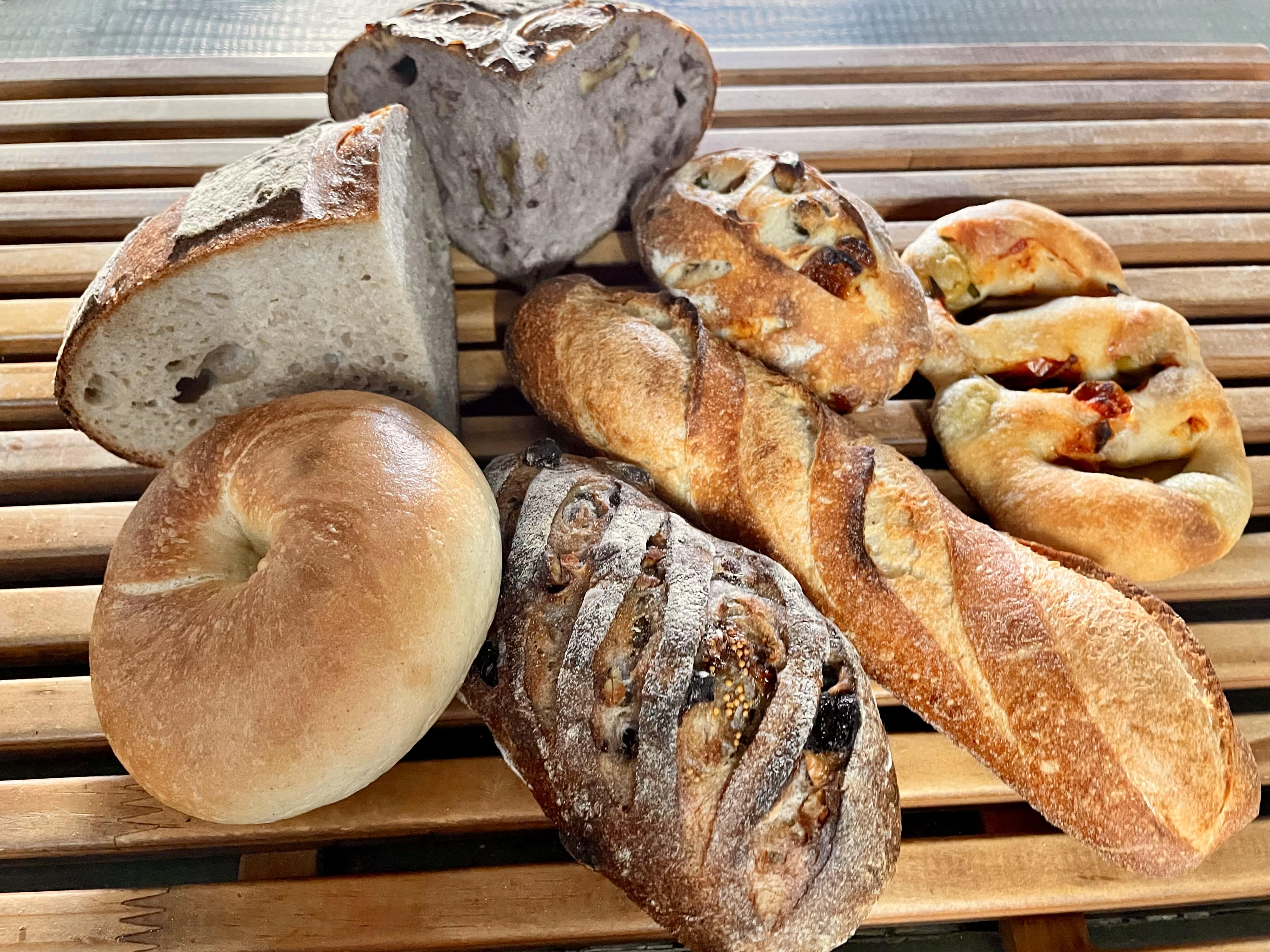 全7個のパン(【季節のパン】あんずとピスタチオ1個・オリーブとセミドライトマトのフガス1個・フリュイ1個・ミニバゲット1個・プレーンベーグル1個・プレーンカンパーニュ1/4サイズ1個・くるみ入りカンパーニュ1/4サイズ1個)