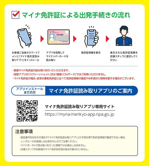 マイナ免許証をお持ちの方は、レンタカーご利用当日にご持参のうえ、出発手続きの際に、お客様ご自身の端末にて、「マイナ免許証読み取りアプリ」を用いてマイナンバーカードを読み取り、免許証情報をご提示いただくことで、レンタカーのご利用が可能です。