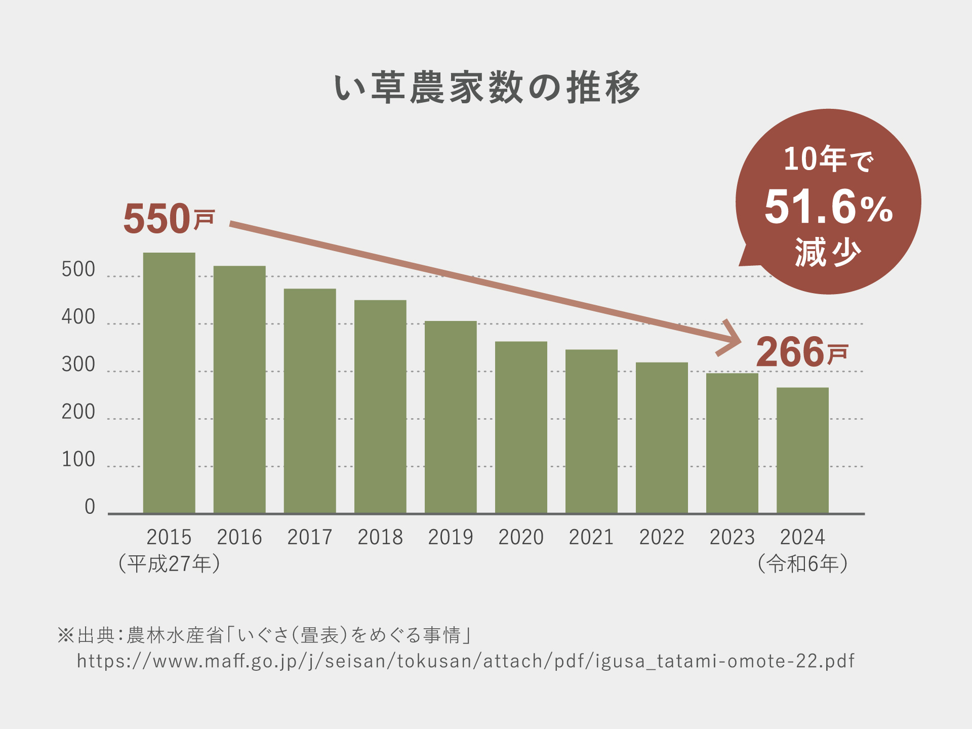 日本の家の洋室化が進み、畳がある家は減少を辿る一方。それに伴い、国内のい草農家の数も年々減少しており、平成27年では550戸あったい草農家は、令和6年には266戸までに半減しました(※1)。物価高や資材高騰などの影響もあり、い草農家を取り巻く環境はより厳しいものになっています。
