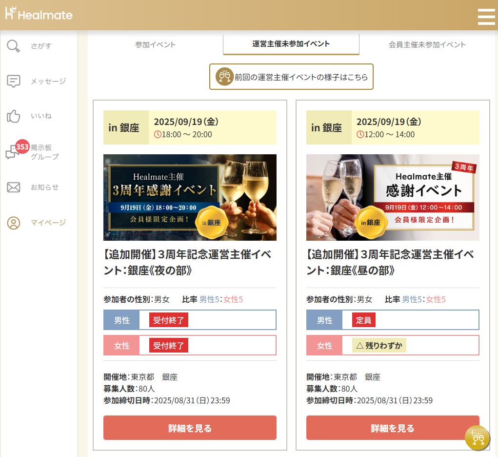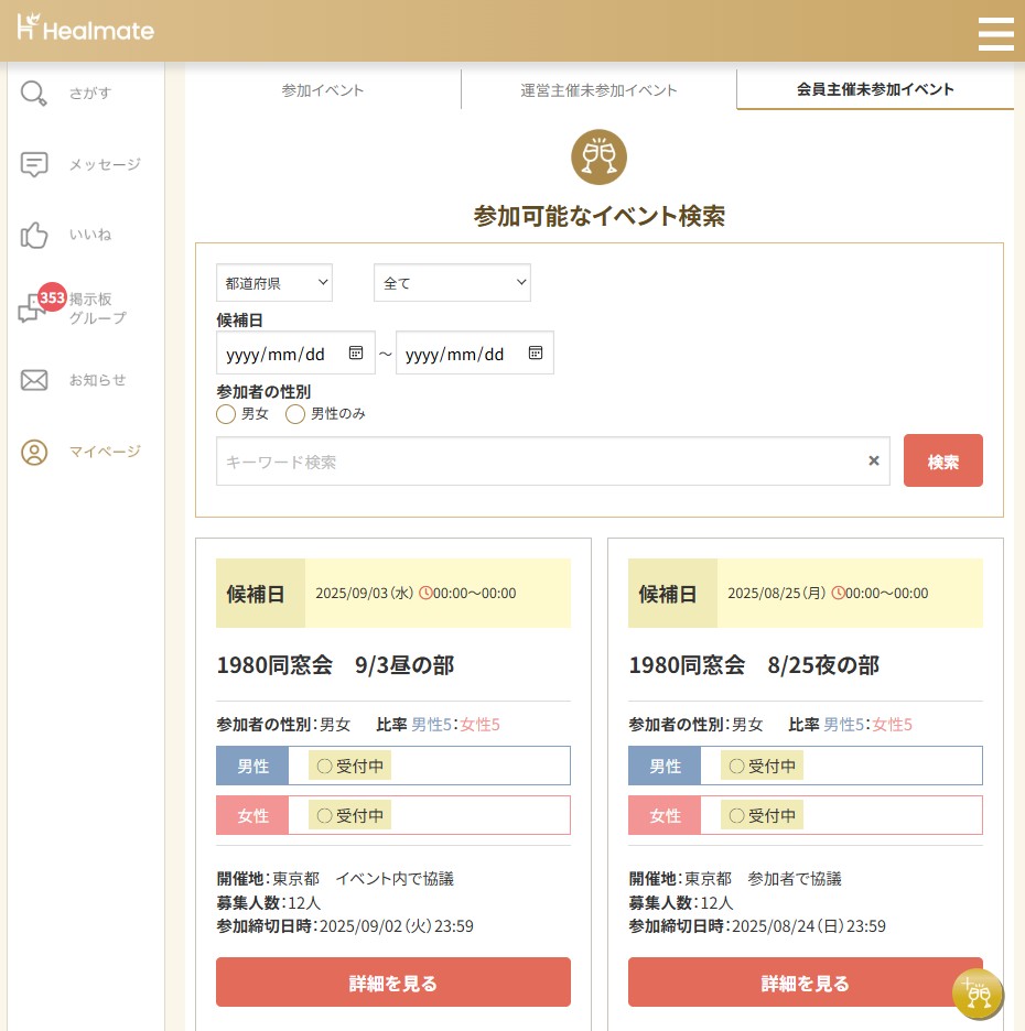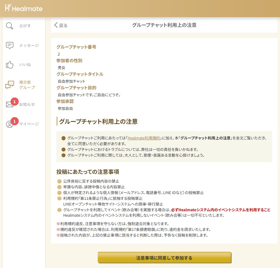 ヒールメイトではグループチャットメンバーがリアルで会う場合はサイト内の会員主催イベントの形を取るのがルールのため、グルチャオフ会も多く開催されています。