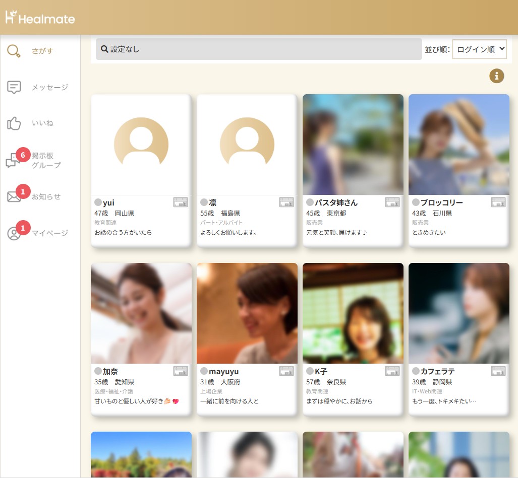 ログインすると最初の画面は、異性会員の検索ページになっています。