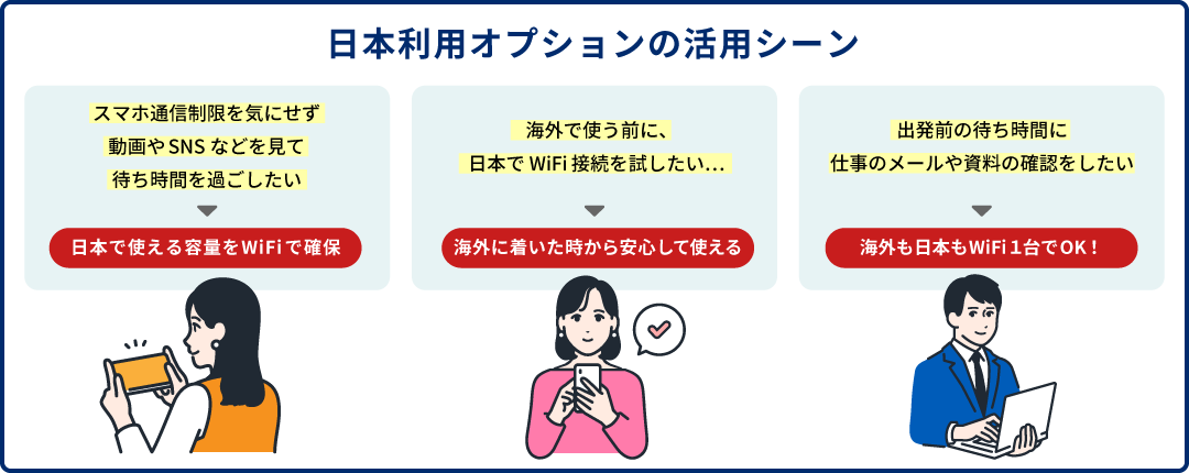 このオプションは、海外渡航前の日本国内でも「グローバルWiFi®」を利用できるサービスです。空港での待ち時間や移動中にWi-Fiを使いたいというお客様の声から誕生しました。さらに、出国前にWi-Fi接続を事前に確認ができるため、安心して海外へ出発していただけます。