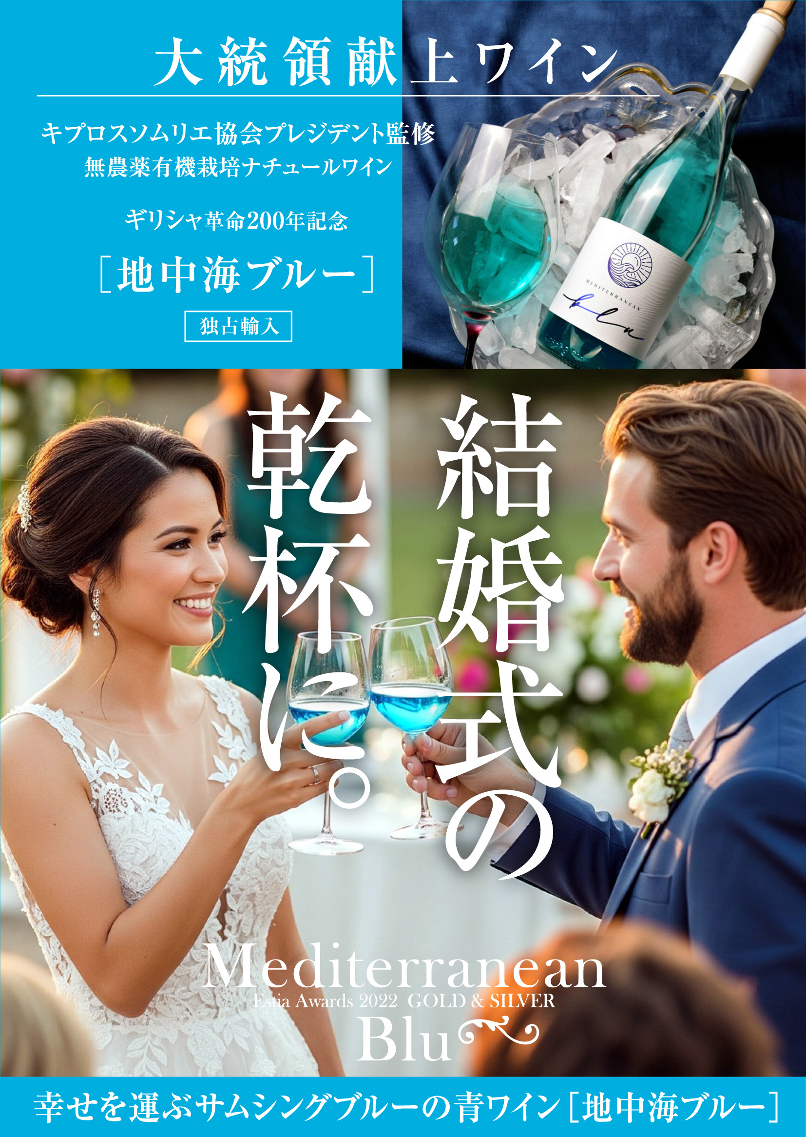 ギリシャ神話の伝説の島、キプロスの青ワイン[地中海ブルー]を日本正規独占輸入!プレスリリース専用URLにて、特別価格で限定販売! キプロスソムリエ協会プレジデント監修、欧州各国「大統領献上ワイン」をご結婚や記念日などの贈り物に、華やかなシーンの乾杯にご利用ください。