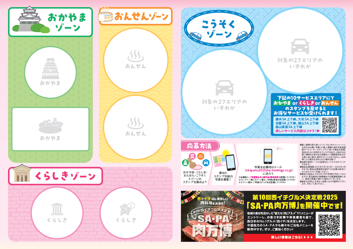 観光地(「おかやまゾーン」・「くらしきゾーン」・「おんせんゾーン」)とSA・PA(「こうそくゾーン」)を巡り、集めたスタンプ数に応じて、抽選で2万円分の美作三湯宿泊券や各観光地グッズ、勝央SA(上下線)・吉備SA(上下線)・蒜山高原SA(上り線)で使用可能なお食事券やSA限定土産セットをプレゼントします。