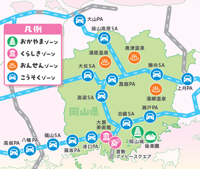 「こうそくゾーン」 : 岡山県周辺のSA・PA (詳細は➊-3参照)