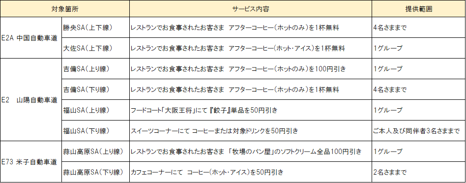 E73岡山自動車道 高梁SA(上下線)、米子自動車道 蒜山高原SA(上下線)、大山PA(上り線)