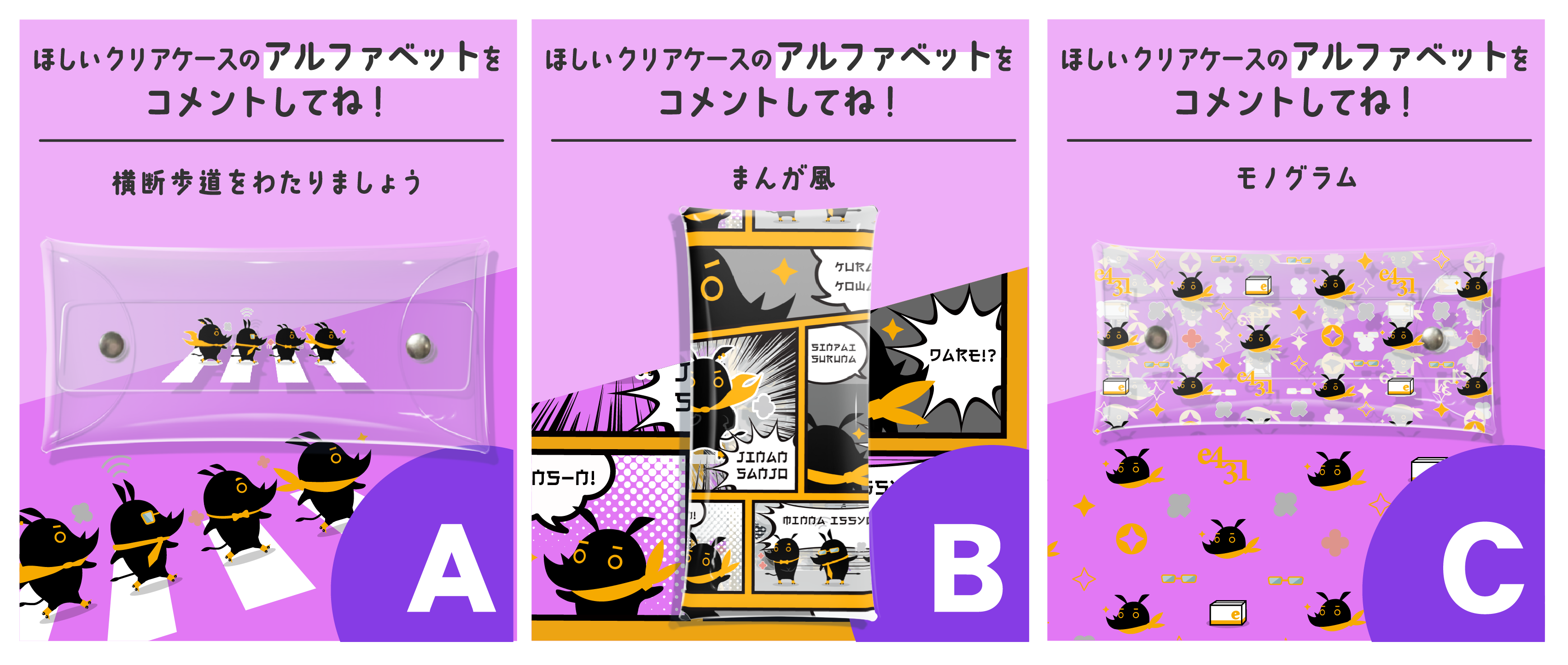 A~Cのデザインからお好きなものをお選びいただき、ご応募ください。