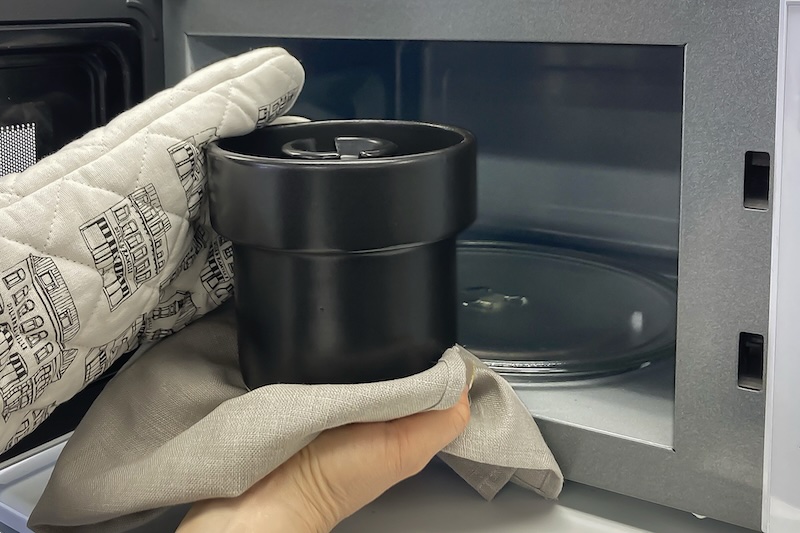土鍋が「かまど」のようにあたたかさを保って蒸らして完成!だからレンジのボタン一つでおいしく炊き上がります。