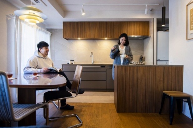 結婚を機に住まい探しを開始されたK様ご夫妻。ユナイテッドアローズ監修リノベーションのデザインを参考にしつつ、細部にこだわり、自由設計の「マイリノ」を選択。内装はお気に入りのウォールナットのダイニングテーブルを中心に設計。スチームサウナ付きの浴室や隠し部屋のような書斎スペースなど、機能性とデザイン性を両立。https://www.globalbase.jp/case/detail.php?jid=176