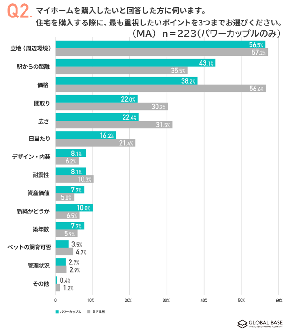 さらに、Q.1でマイホームを購入したいと回答した方に、「住宅を購入する際に、最も重視したいポイントを3つまでお選びください。」と訊いたところ、パワーカップルの第1位が「立地(周辺環境)」(56.5%)、第2位が「駅からの距離」(43.1%)、第3位が「価格」(38.2%)という結果になりました。一方で、世帯年収600万円~1,000万円のミドル層は、第1位が「立地(周辺環境)」(57.2%)、第2位が「価格」(56.6%)、第3位が「駅からの距離」(35.5%)という結果になりました。パワーカップルとミドル層を比較すると、ミドル層のほうが価格を重視していることがわかります。