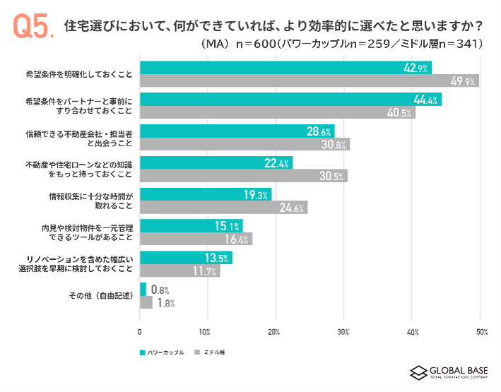 さらに、マイホームを所有する方を対象に「住宅選びにおいて、何ができていれば、より効率的に選べたと思いますか?」と訊いたところ、パワーカップル・ミドル層のいずれからも最も多かった回答は「希望条件を明確化しておくこと」でした。次いで多かったのは「希望条件をパートナーと事前にすり合わせておくこと」で、いずれも住宅購入においての“事前準備”の重要性がうかがえる結果となりました。