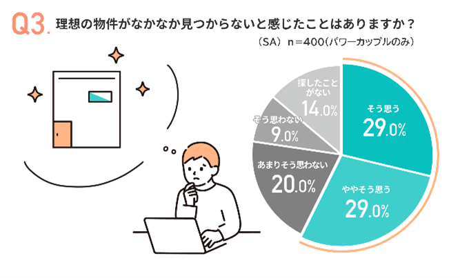 パワーカップルに「理想の物件がなかなか見つからないと感じたことはありますか?」と訊いたところ、「そう思う」(29.0%)、「ややそう思う」(29.0%)の回答は合わせて58.0%になり、半数以上が理想の物件がなかなか見つからないと感じたことがあるという結果となりました。