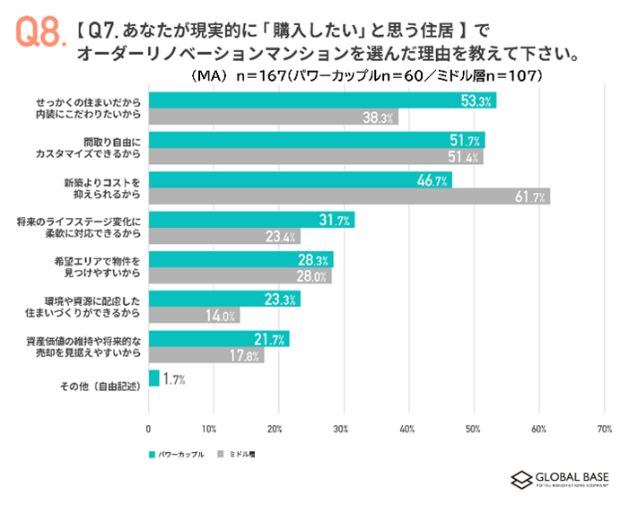 Q8.【Q7.あなたが現実的に「購入したい」と思う住居】でオーダーリノベーションマンションを選んだ理由を教えて下さい。(MA) n=167(パワーカップルn=60/ミドル層n=107)