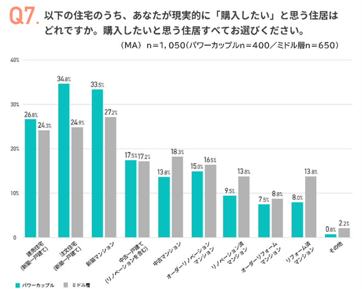 Q7.以下の住宅のうち、あなたが現実的に「購入したい」と思う住居はどれですか。購入したいと思う住居すべてお選びください。(MA) n=1,050(パワーカップルn=400/ミドル層n=650)