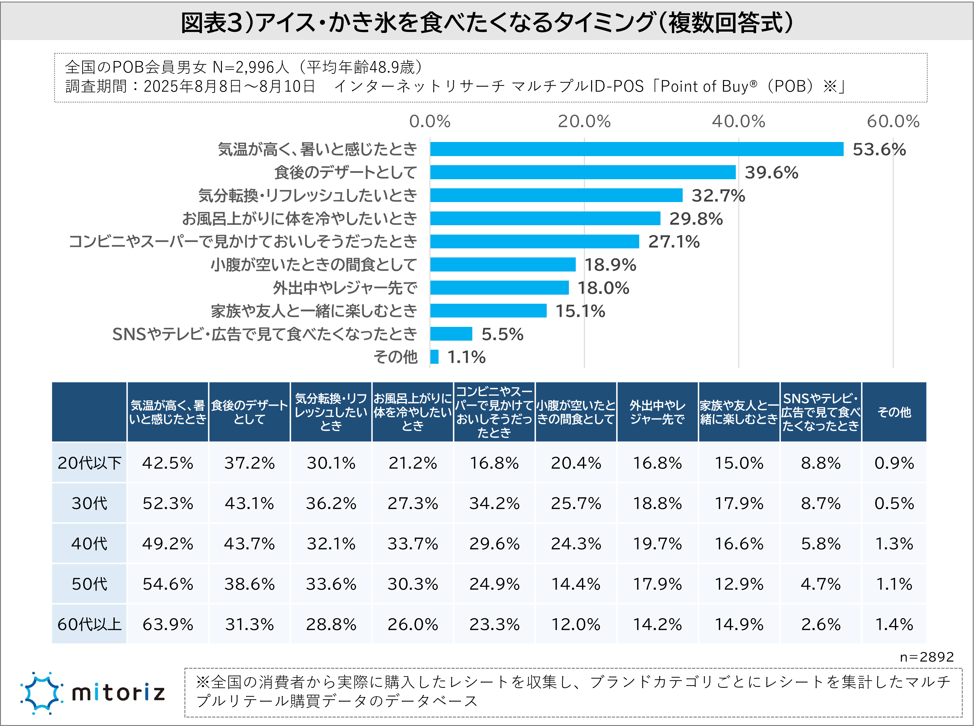 ・食べたくなるタイミングは「気温が高く、暑いと感じたとき」が53.6%、シニア層ほどその傾向が顕著