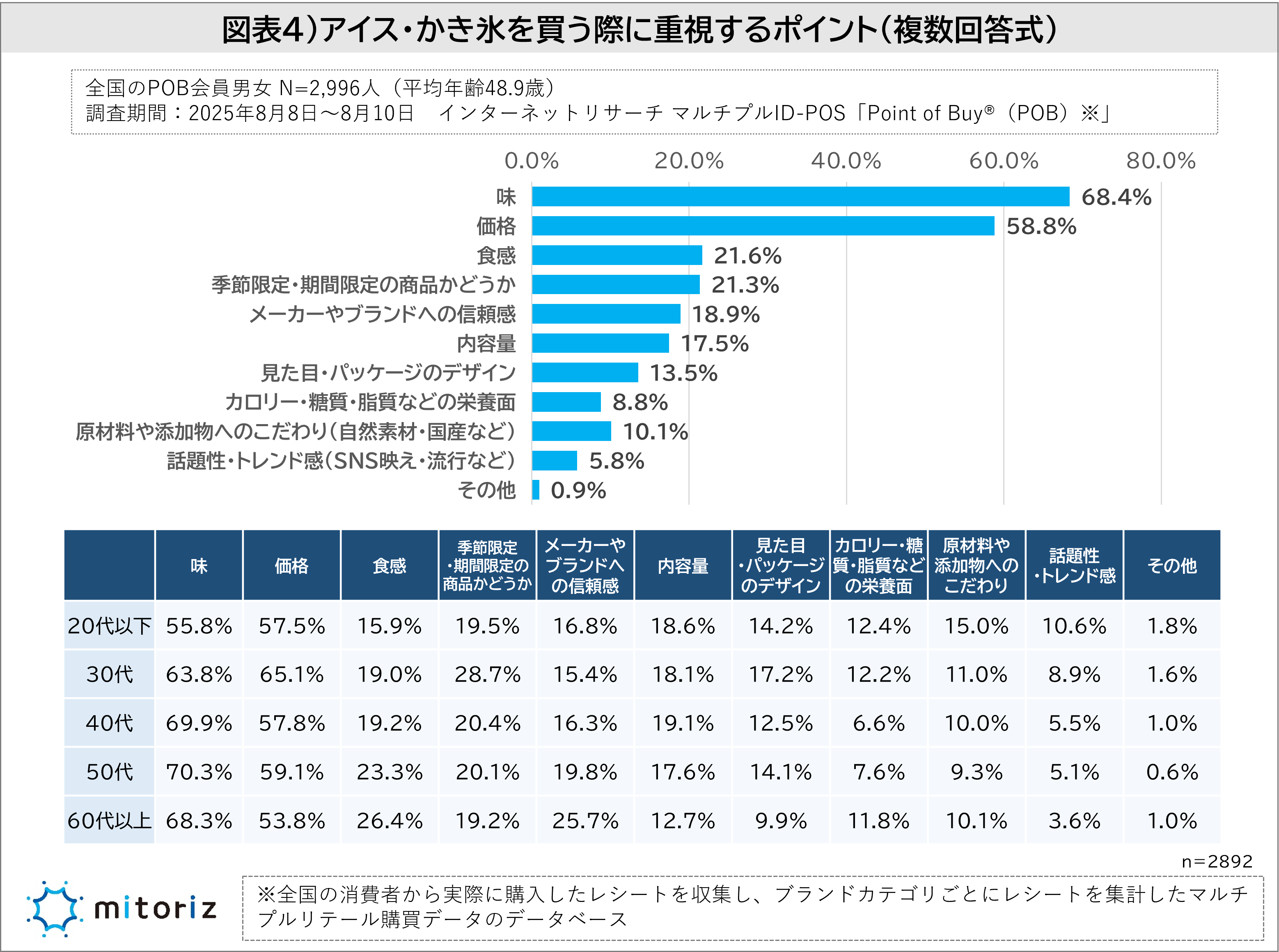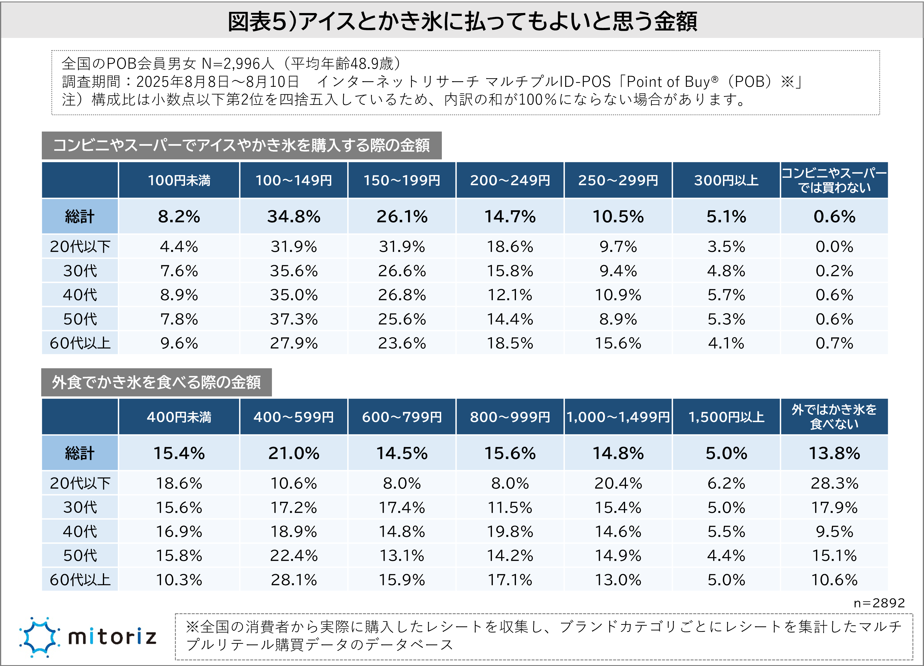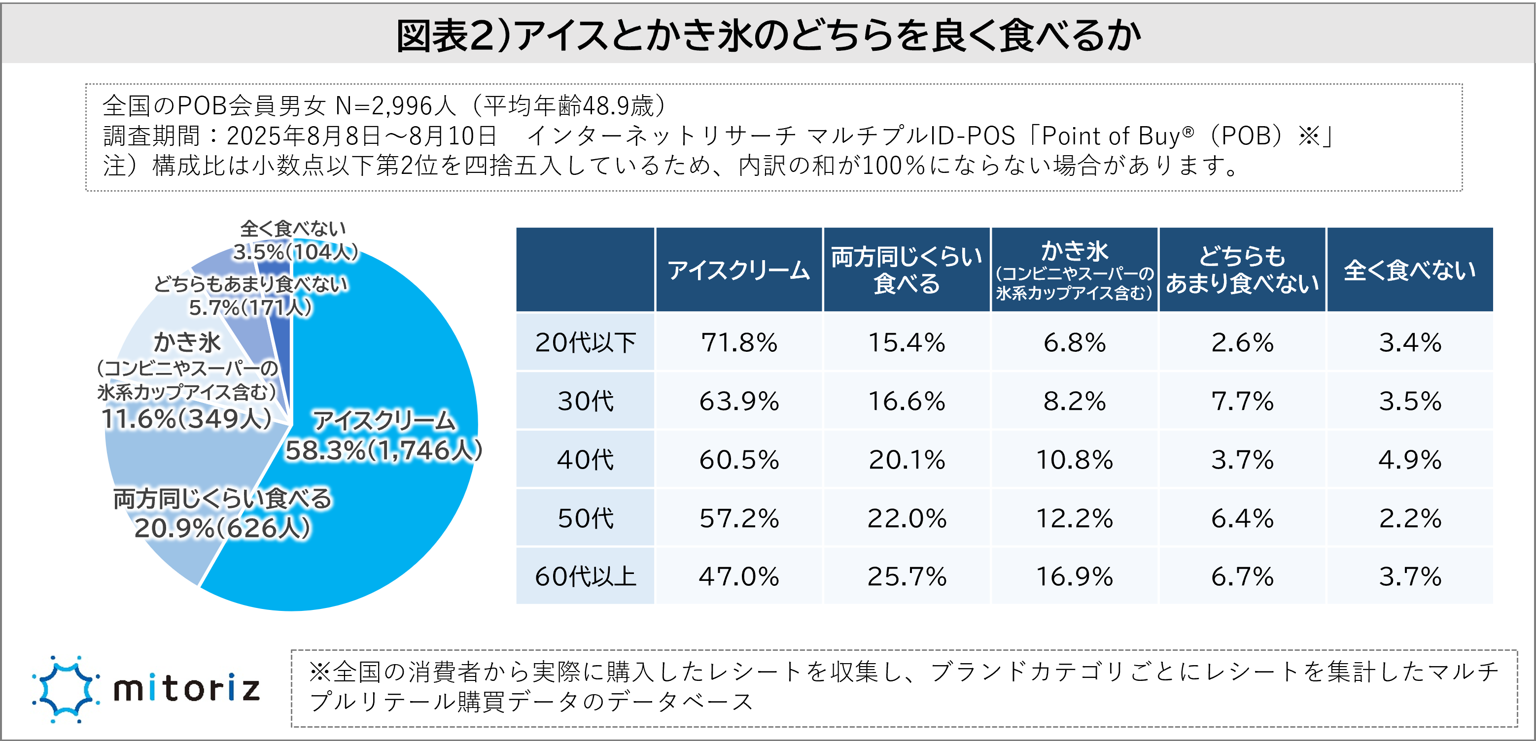 株式会社mitoriz(本社:東京都港区、代表取締役社長:原田光幸)は、消費者購買行動データサービス「Point of Buy®(以下、POB)」の会員2,996人を対象に「アイス・かき氷に関する調査」を実施しました。