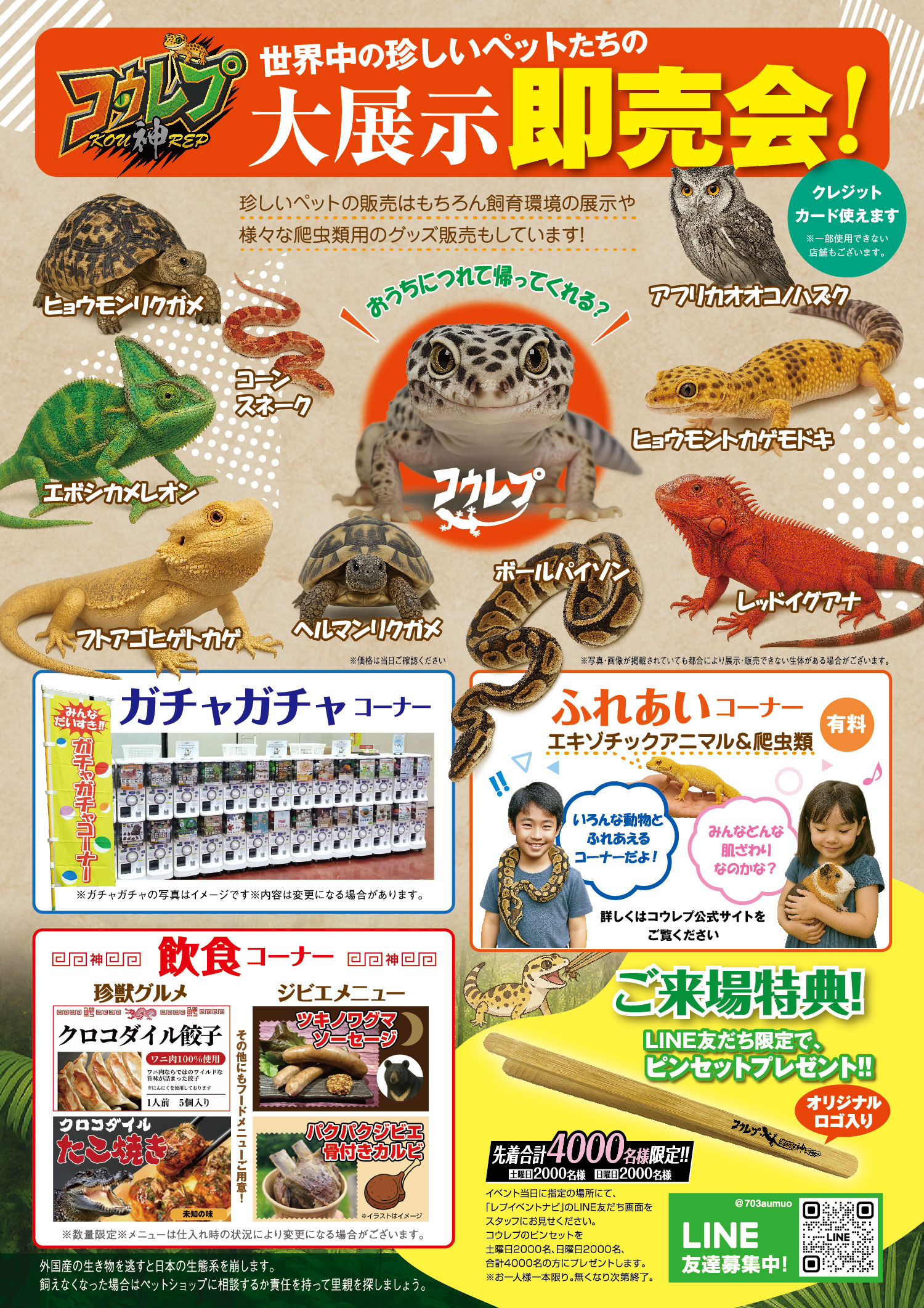 「コウレプ」爬虫類・両生類・猛禽類から小動物まで大集合!見て・触れて・知って・迎えられる体験型展示即売会。プロのブリーダーや専門ショップによる安心の飼育アドバイスやふれあい体験も充実。家族みんなで楽しめるイベントです。