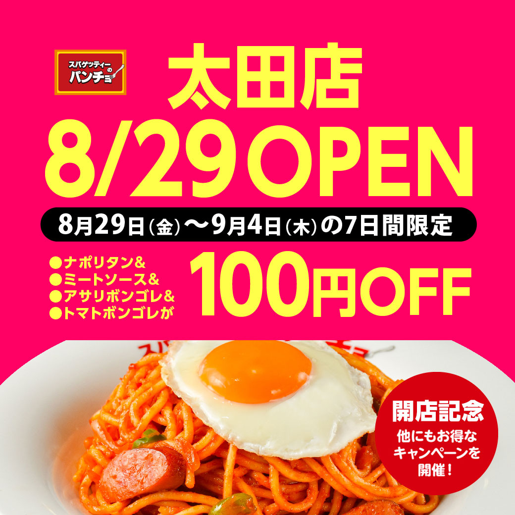 「スパゲッティーのパンチョ 太田店」が8/29(金)に新規開店、4連続オープニングキャンペーンを開催!