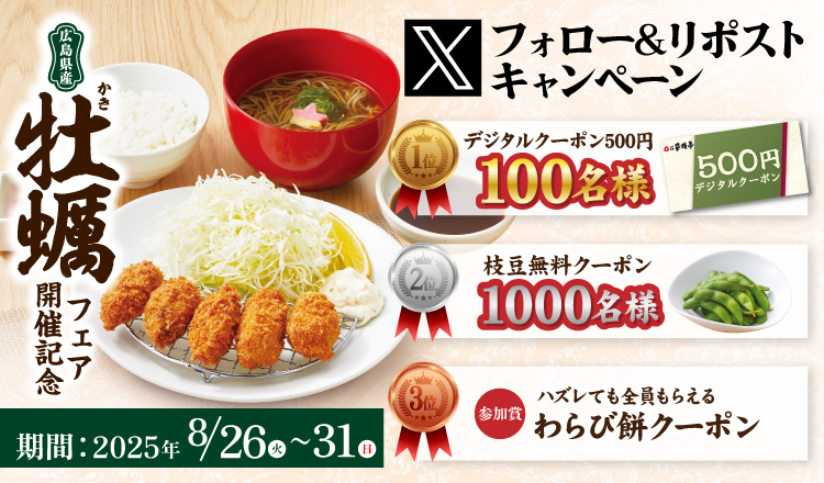 また、広島県産カキフライフェアの開催を記念して、家族亭公式Xでは「フォロー&リポストキャンペーン」を実施いたします。キャンペーン投稿をフォロー&リポストしていただいた方の中から、抽選で、1等:家族亭デジタルクーポン500円引(100名様)、2等:枝豆無料クーポン(1,000名様)、3等:参加賞としてミニわらび餅クーポンのいずれかの賞品が必ず当たる、お得なキャンペーンです。