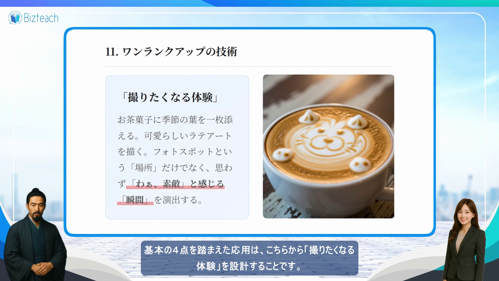 歴史的偉人たちが、AIアバターとして登場。彼らが現代のビジネス課題に対して、日本の現代ビジネスに沿ったアドバイスをくれます。声・話し方・哲学的思考もAIで再現されており、研修というより「学びの物語」に近い体験が得られます。