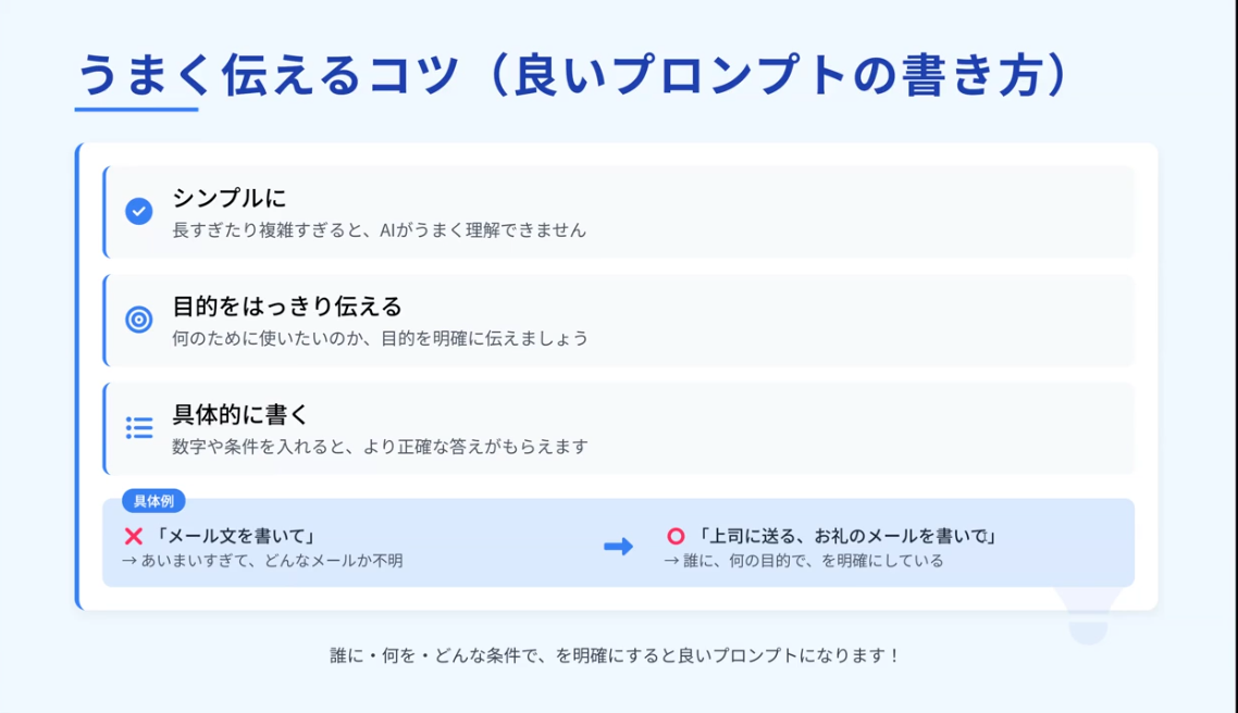 指示の出し方ひとつで出力結果がどう変わるかを比較体験