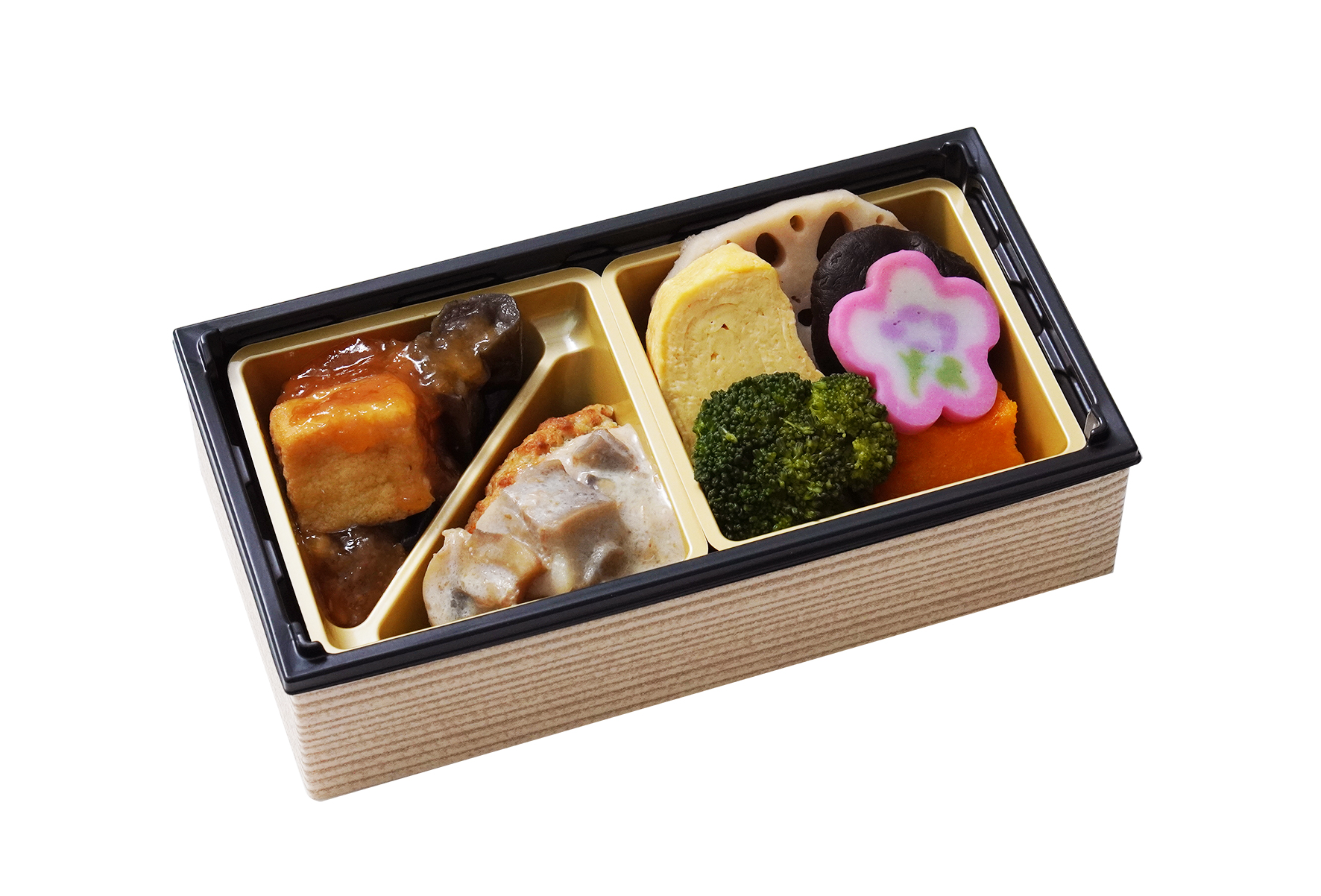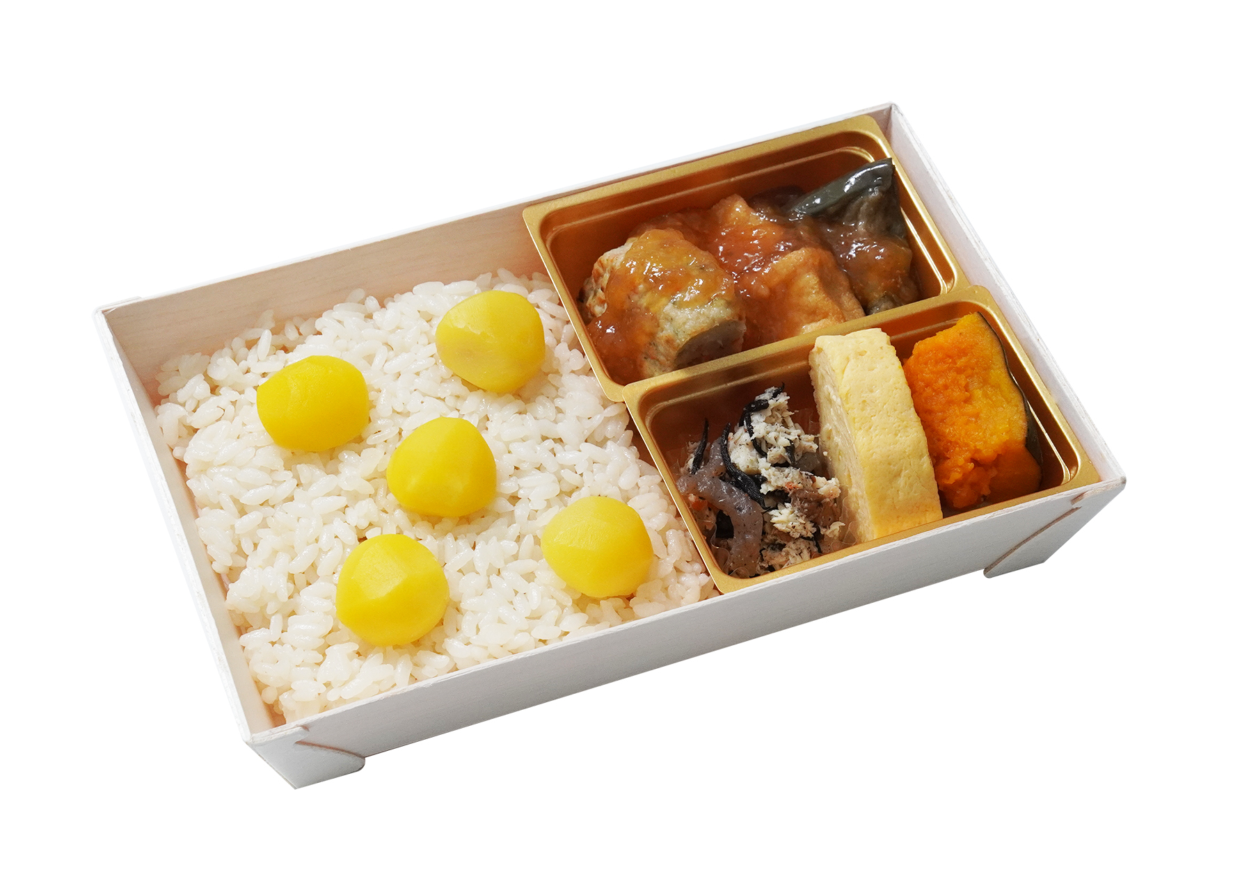 栗の甘露煮を乗せただし炊き込みご飯に、かつお節入りみぞれ餡をたっぷりとかけた豆腐ハンバーグや、だしをきかせたおかずを詰め合せた秋限定のお弁当です。