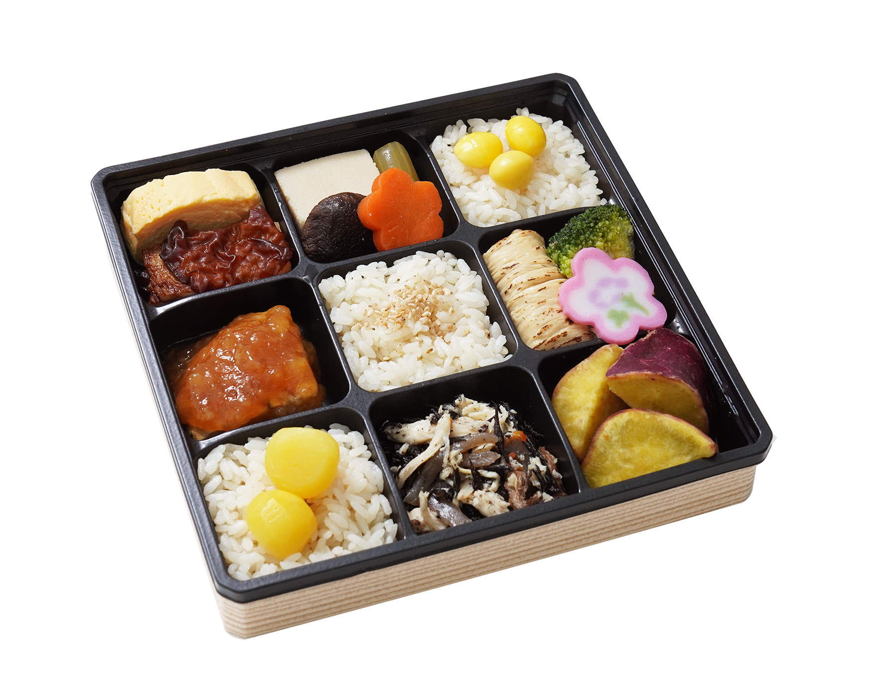 栗や銀杏、炒りごまを乗せただし炊き込みご飯に、おだしがきいた様々なおかずを彩り豊かに詰め合せたお弁当です。柔らかな豆腐ハンバーグには、かつお節入りみぞれ餡をかけました。