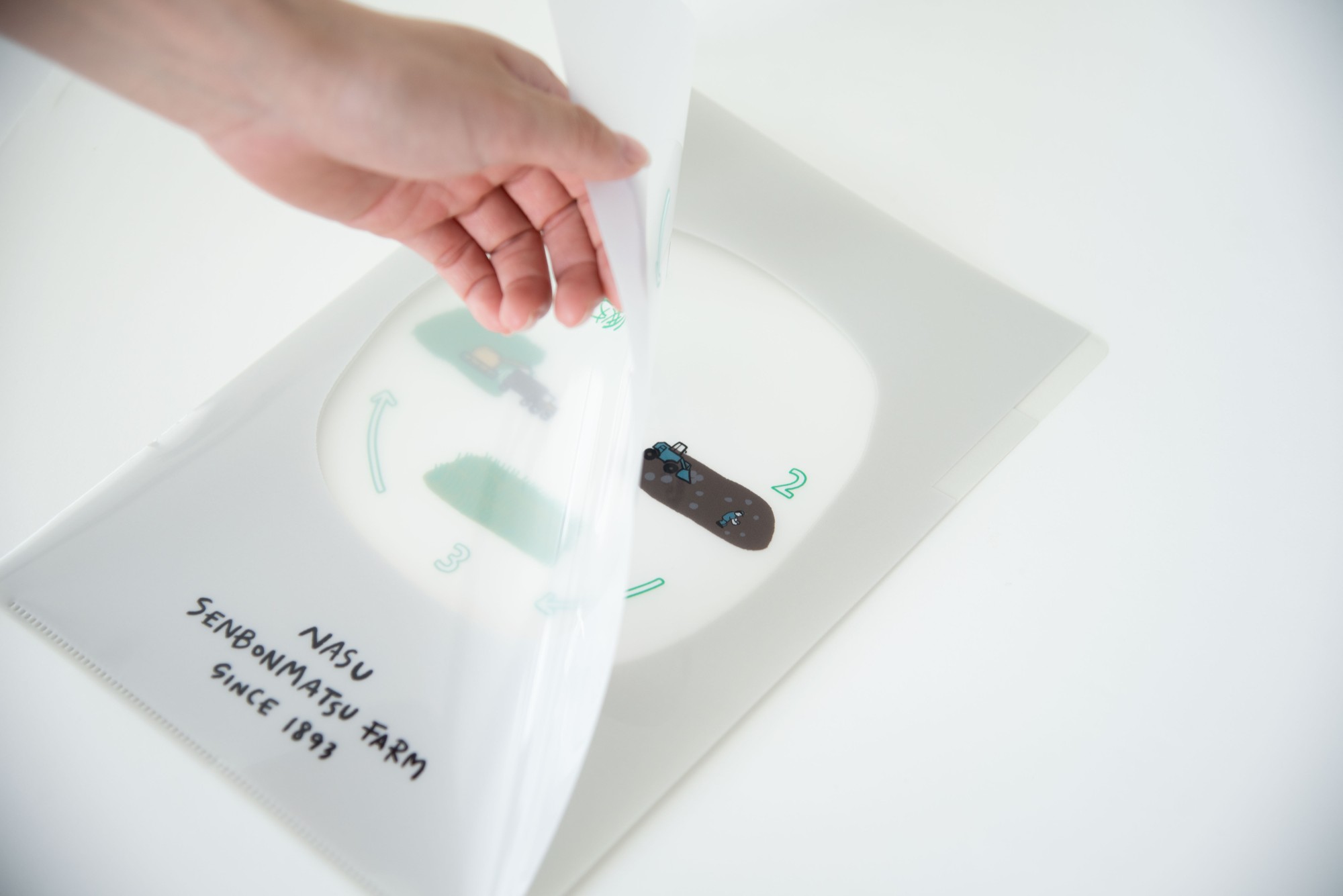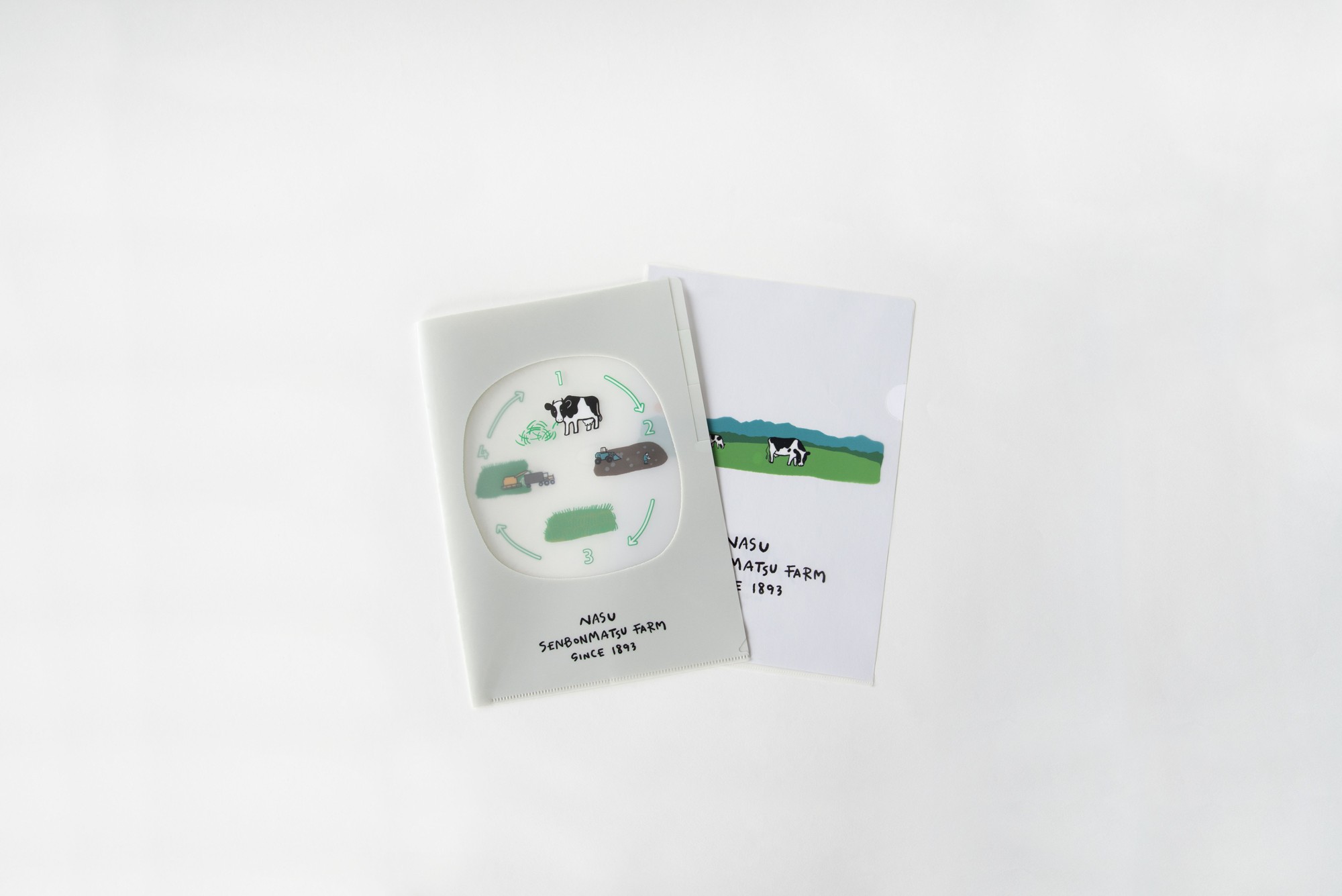 牧場の魅力を日常使いのステーショナリーに落とし込んだアイテム。表面にはのどかな牧場風景が描かれており、書類を入れても絵柄が邪魔にならないように透明部分を大きく取っているため、中身を確認しやすく実用的です。さらに中仕切りタイプは、3つのポケットで書類を分類できる仕様になっており、仕切りごとに「土づくり→牧草づくり→ミルクの生産」といった循環型酪農の流れをイラストで表現。
