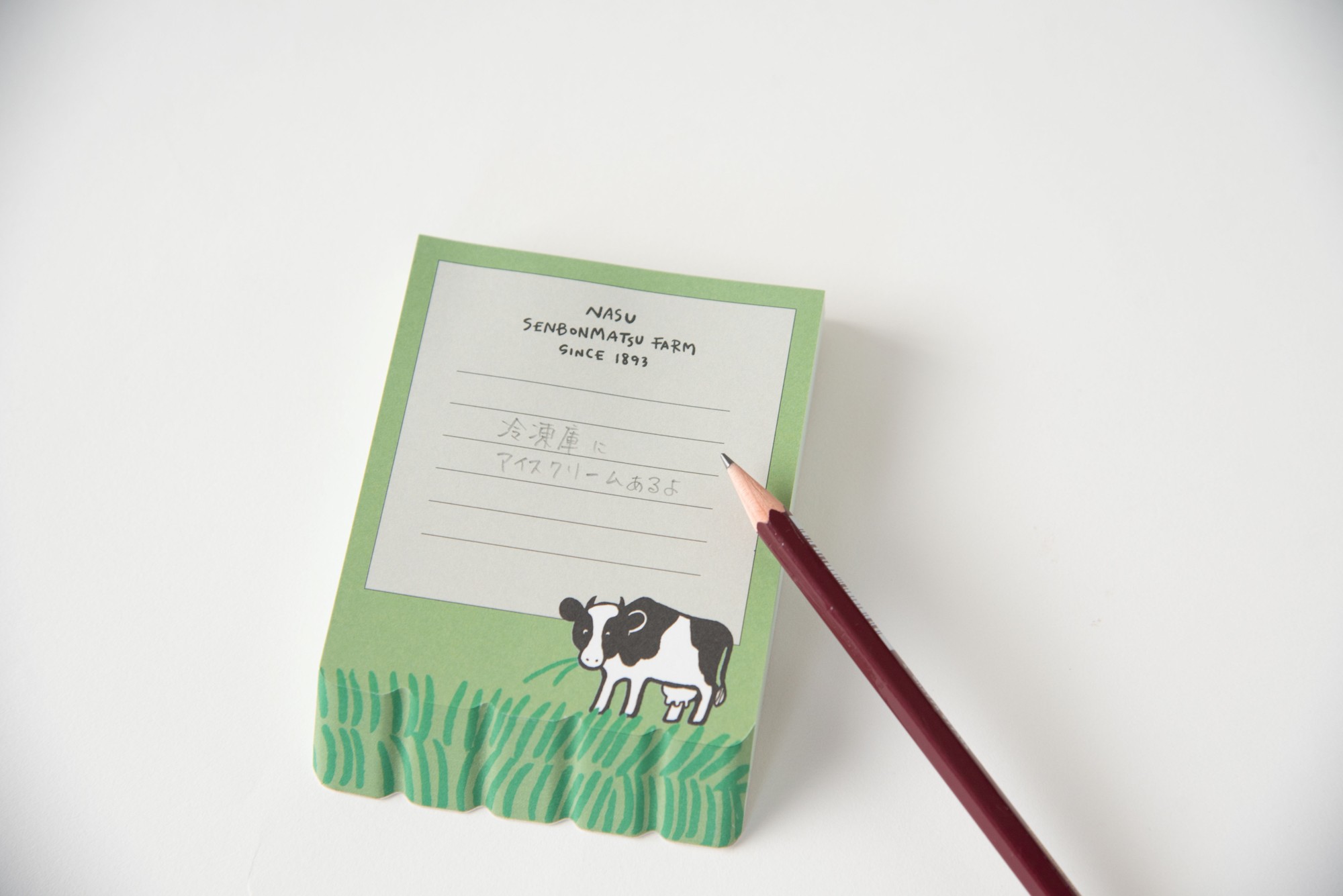 のどかな牧場風景を描いた50枚綴りの付箋です。セボンが暮らす千本松牧場の美しい自然とのんびりとした雰囲気をデザインに込めており、手帳やノート、書類に貼るだけで心が和む仕上がりで、ちょっとしたメッセージを書く際にも、おすすめです。