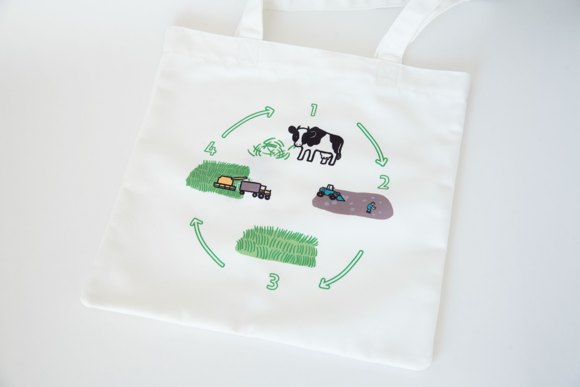 一部商品には再生繊維を採用し、環境に配慮した商品作りを行っています。牧場の循環型酪農の理念と調和するグッズです。