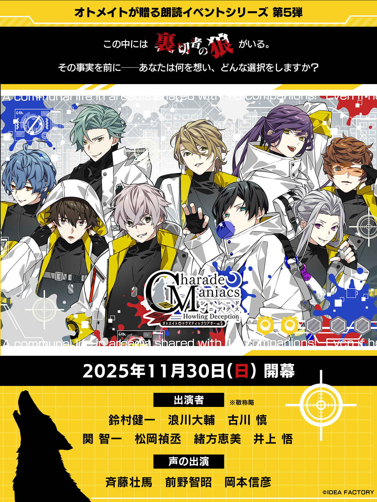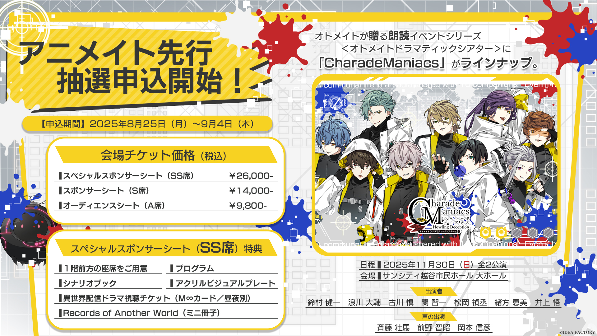 アイディアファクトリー株式会社(代表取締役社長:佐藤 嘉晃/所在地:東京都豊島区)の女性向けゲームブランド「オトメイト」は、2025年11月30日(日)にサンシティ越谷市民ホール 大ホールにて開催する、オトメイトドラマティックシアターvol.05「CharadeManiacs -Howling Deception-」のアニメイト先行抽選の申込みを本日より開始いたしました。