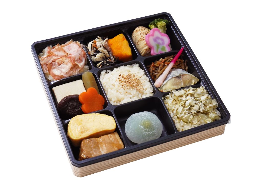 本枯鰹節や削り昆布、ごまを乗せただし炊き込みご飯と、彩り豊かな惣菜を詰め合せたお弁当です。おだしがきいた様々なおかずをお楽しみいただけます。
